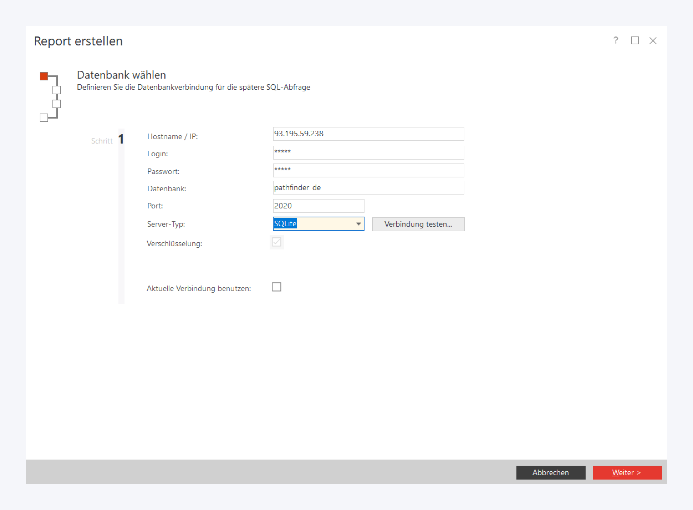 Wenn Sie die aktuelle Datenbankverbindung verwenden möchten, setzen Sie das entsprechende Häkchen und klicken Sie auf Weiter. Andernfalls geben Sie die Verbindungsdaten der gewünschten Datenbank an: