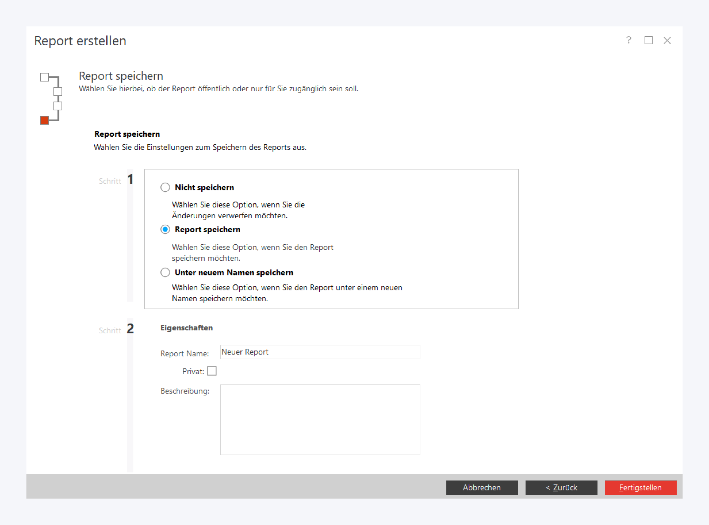 Schlussendlich können Sie entscheiden, ob der Report gespeichert werden soll. Geben Sie bei Bedarf einen Namen und eine Beschreibung an. Wenn Sie den Report als Privat markieren, wird er anderen Benutzern nicht angezeigt.