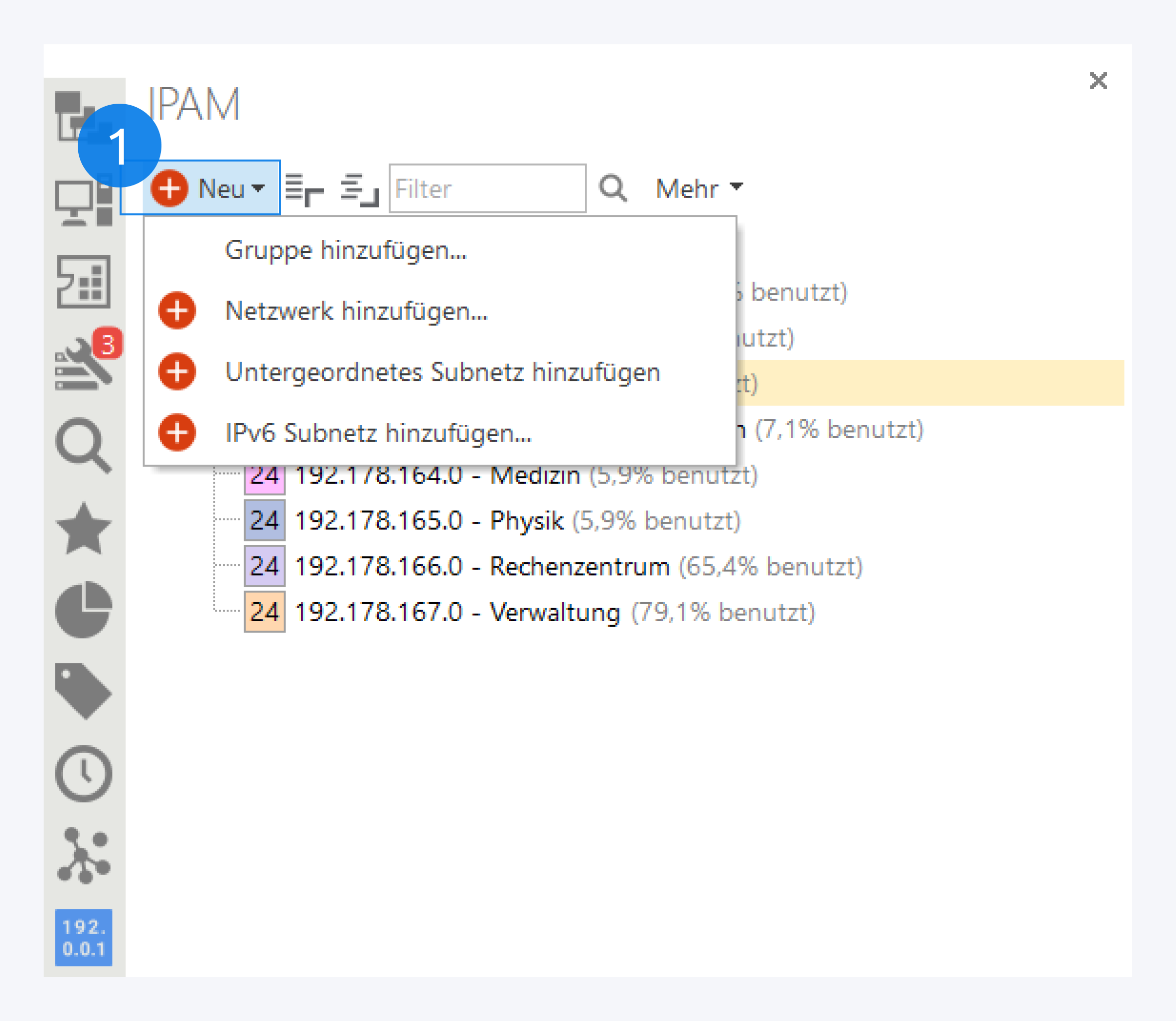 Über das Plus-Icon (1) können Sie neue Netzwerke, Subnetze und Gruppen erstellen.