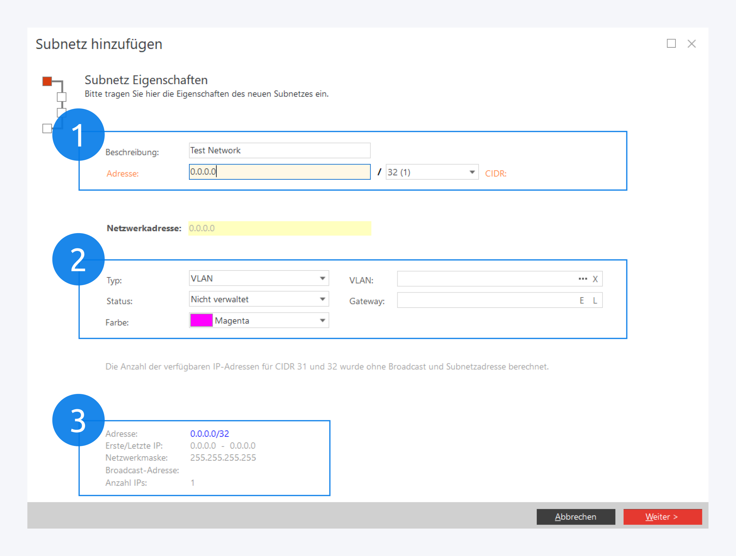Unten wird ein Überblick über das Subnetz basierend auf den Eingaben angezeigt (3).