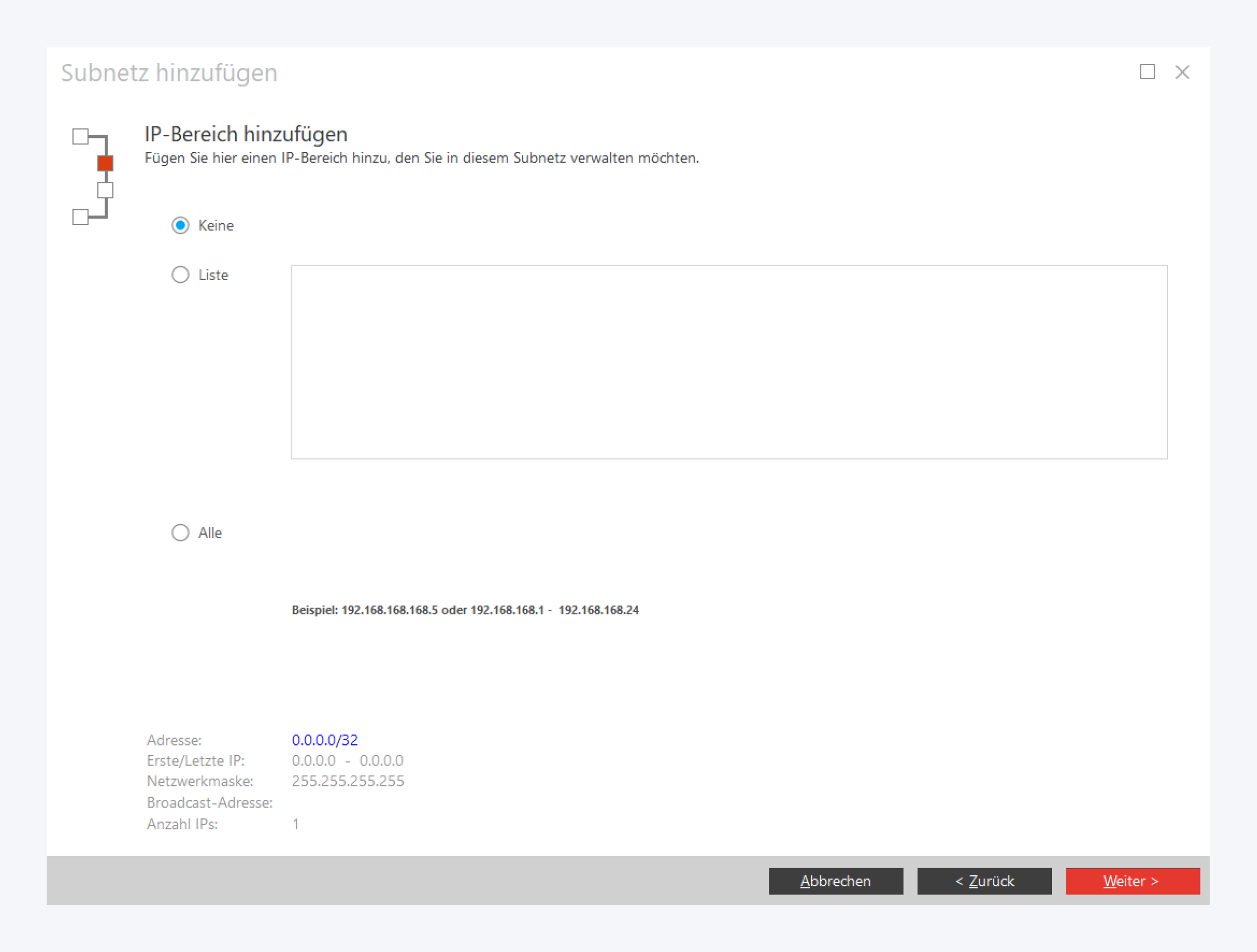 Wählen Sie aus, welche IP-Adressen aus dem Subnetz in Pathfinder erstellt werden sollen. Mit Keine werden keine IP-Adressen erstellt, Alle erstellt sämtliche IP-Adressen im Subnetz. Alternativ kann eine Liste angegeben werden.