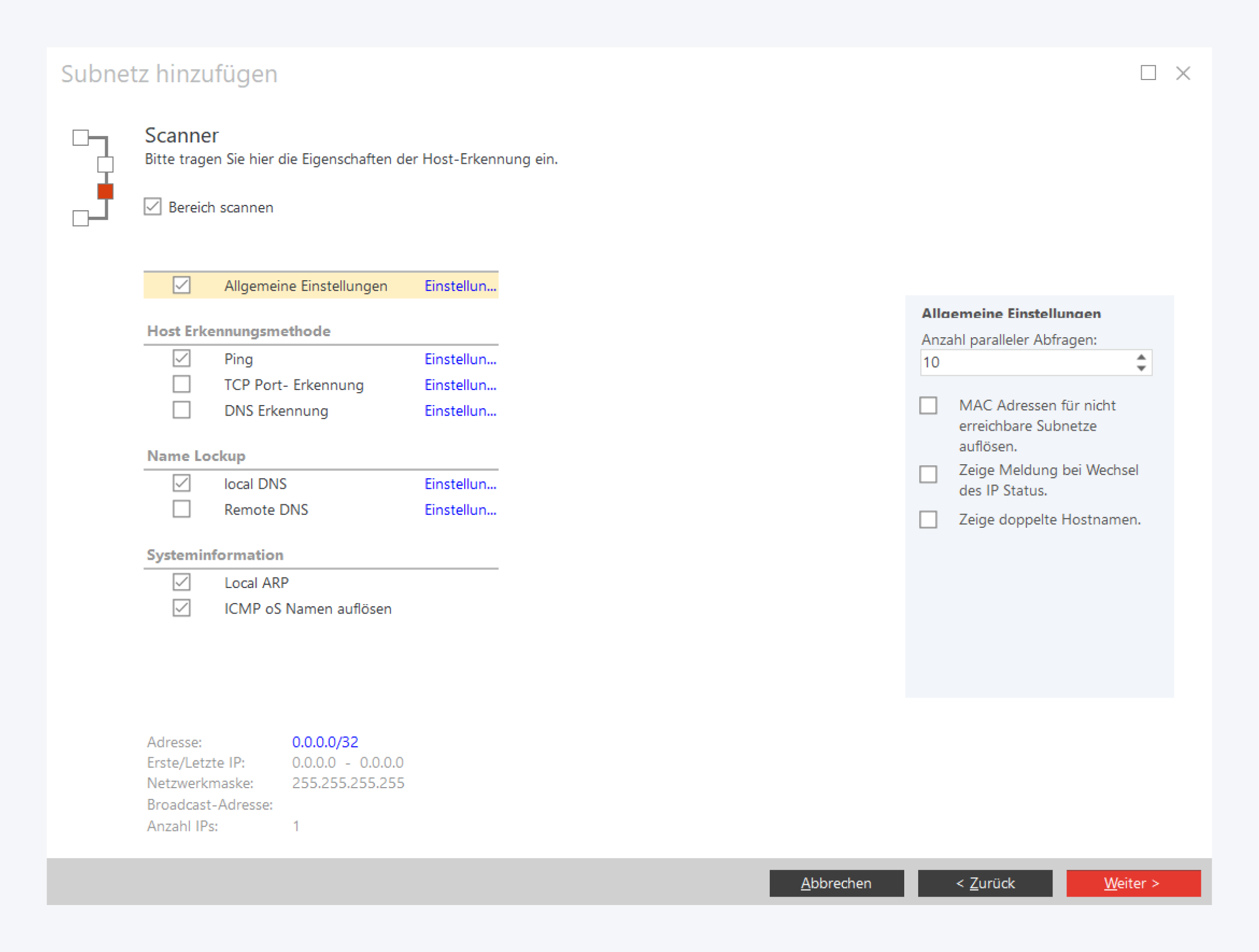 Nun kann das Subnetz gescannt werden. In den allgemeinen Einstellungen auf der rechten Seite kann die Anzahl paralleler Abfragen festgelegt und entschieden werden, welche Informationen abgerufen werden sollen.
