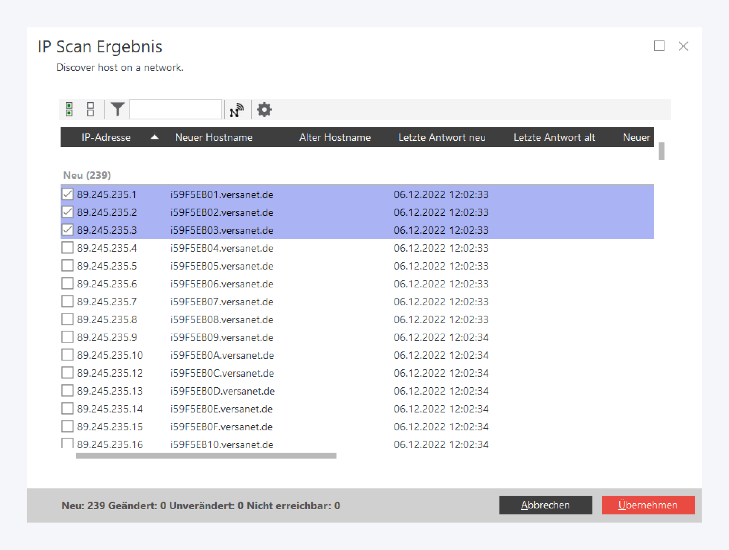 Es werden nun die Scanergebnisse angezeigt. Wählen Sie die IP-Adressen aus, für die die Änderungen gespeichert werden sollen, und klicken Sie auf Übernehmen.