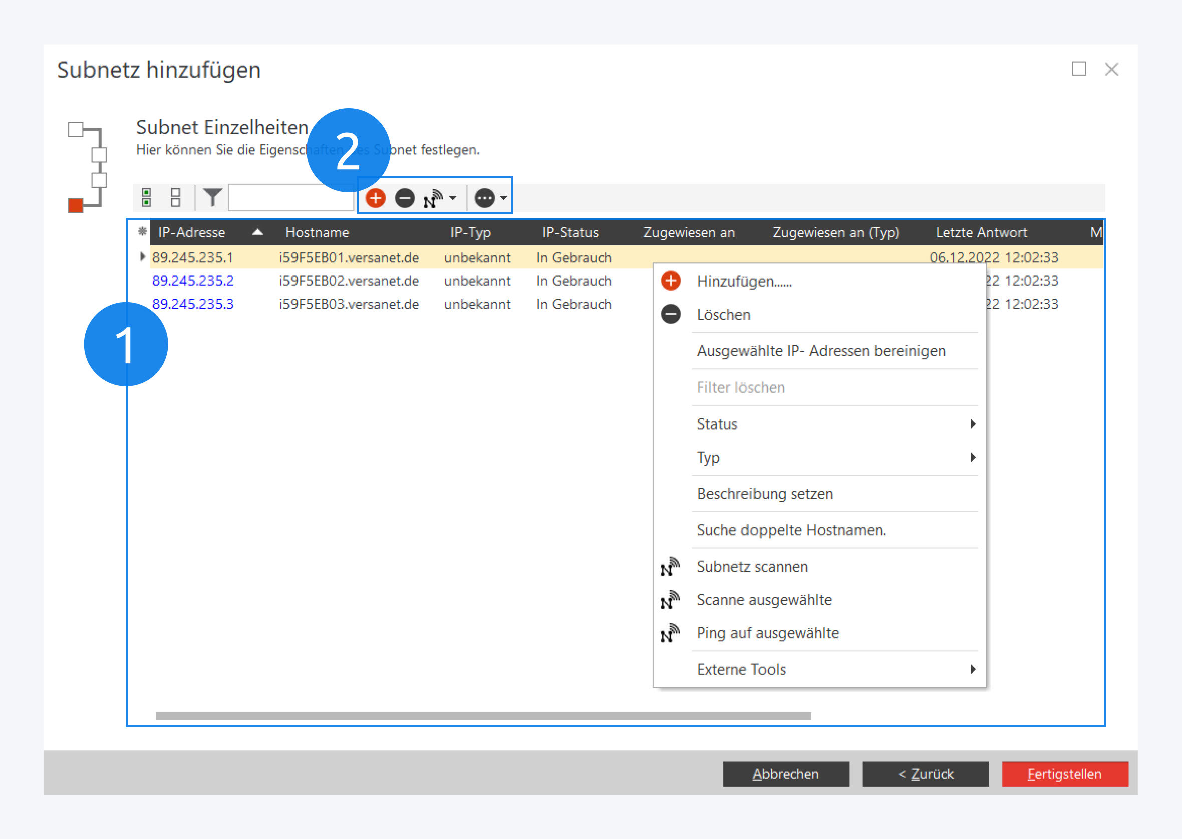 Abschließend wird eine Zusammenfassung des Subnetzes angezeigt (1). Sie können IP-Adressen hinzufügen oder entfernen, sowie einen erneuten Scan durchführen (2).