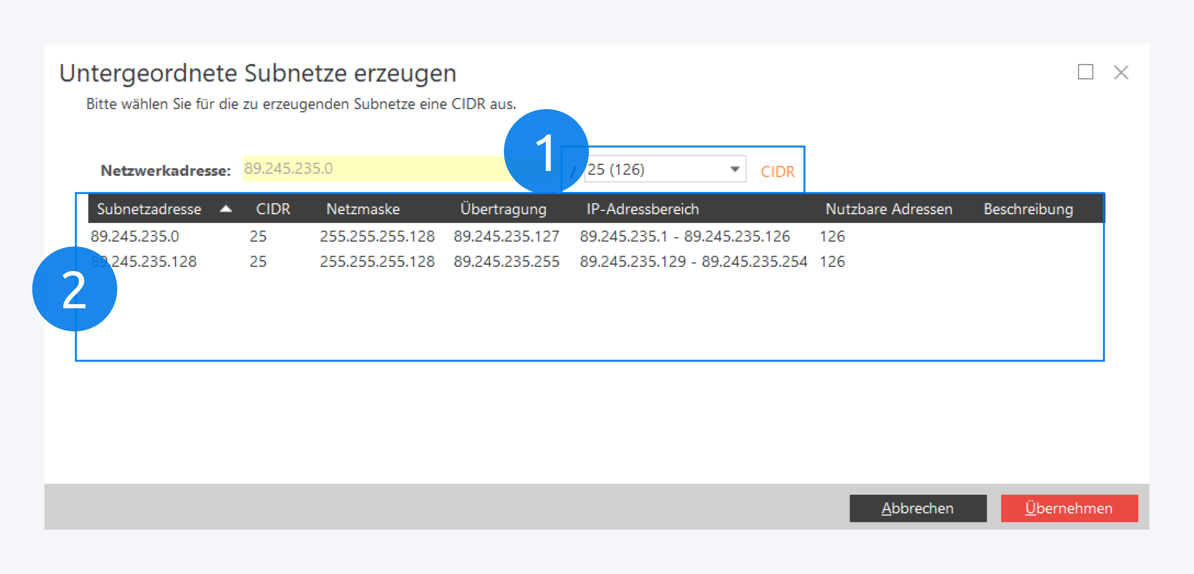 Geben Sie hierzu den neuen CIDR (1) an. Anschließend wird das Subnetz entsprechend aufgeteilt und im unteren Bereich eine Vorschau auf das Ergebnis angezeigt (2).