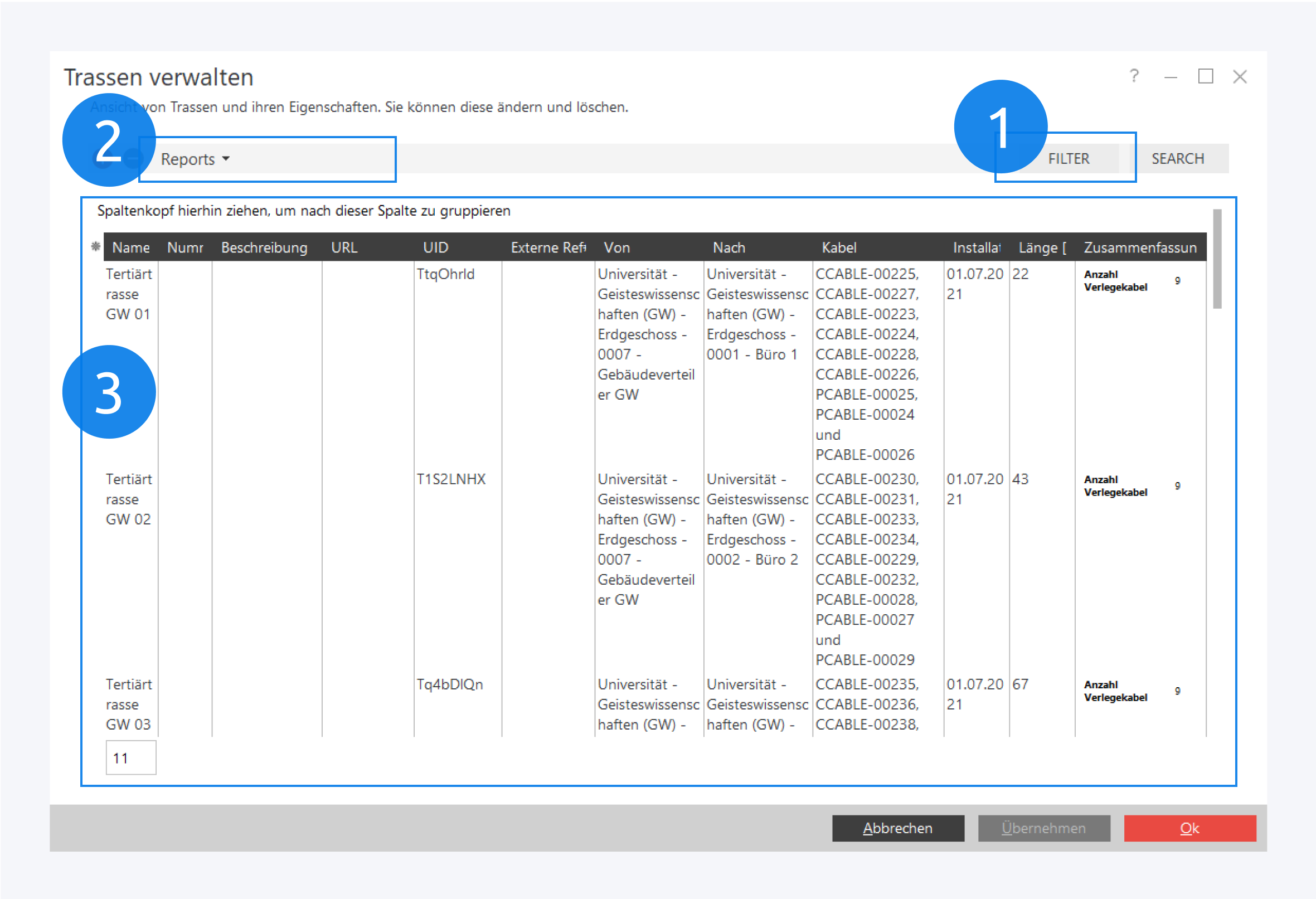 Im unteren Bereich befindet sich die Instanzliste (3). Nutzen Sie das Stern-Icon, um Felder beliebig ein- oder auszublenden. Ziehen Sie einen Spaltenkopf nach oben, um die Liste nach dieser Eigenschaft zu gruppieren.