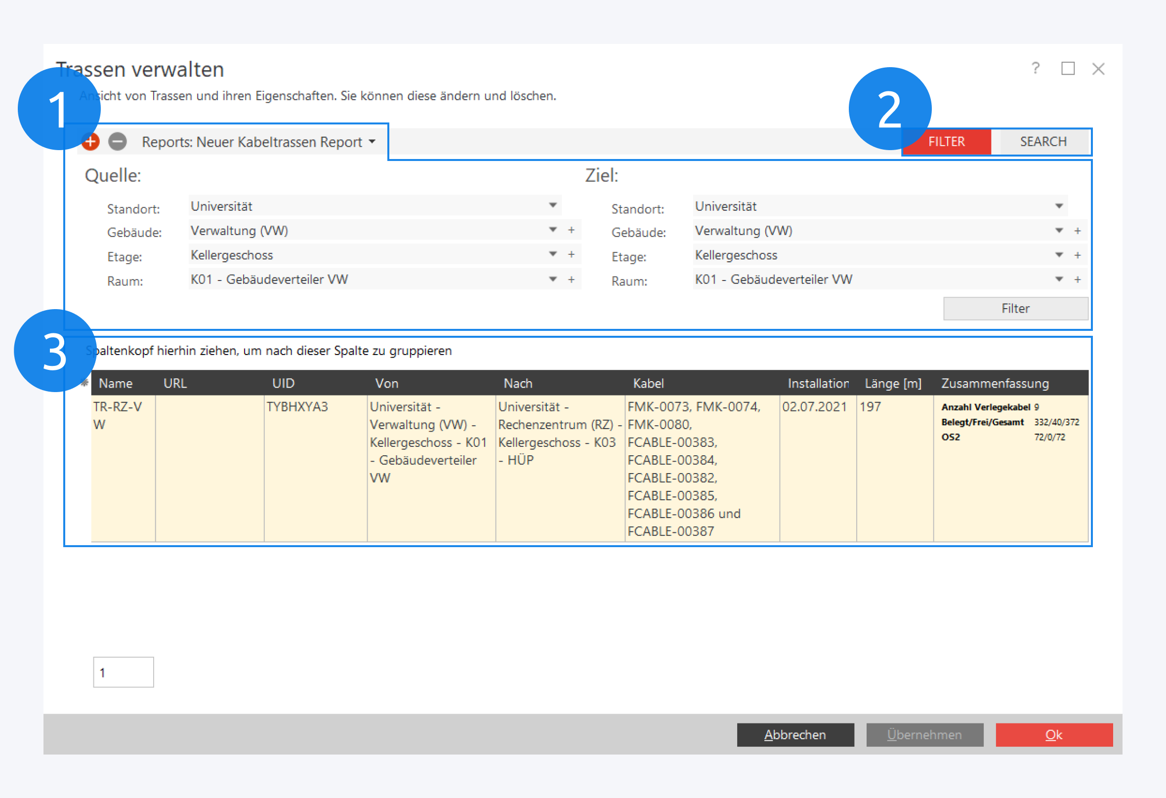 Trassenreports werden verwendet, um speziell gefilterte Instanzlisten auf Knopfdruck abrufbar zu machen.
