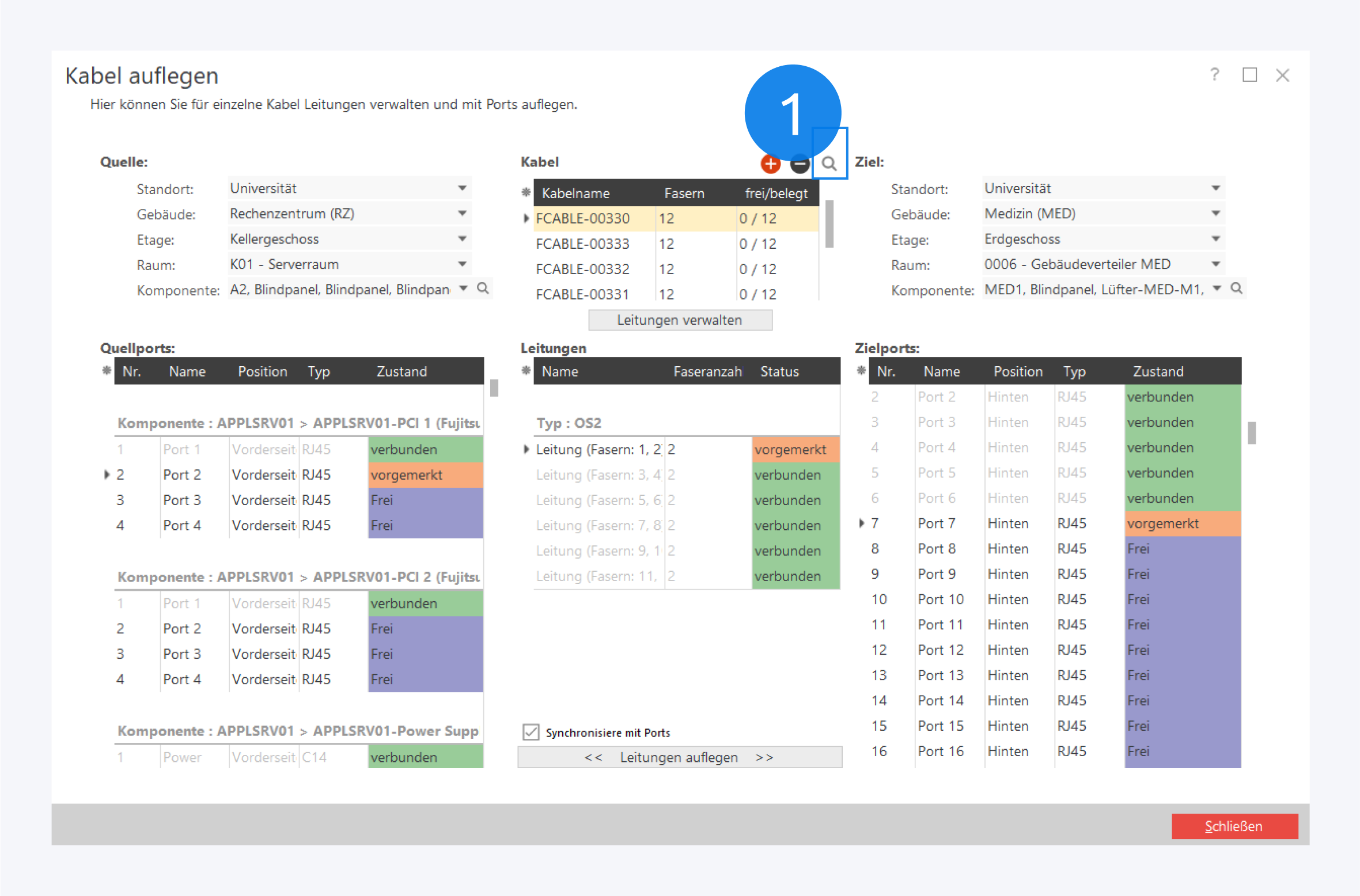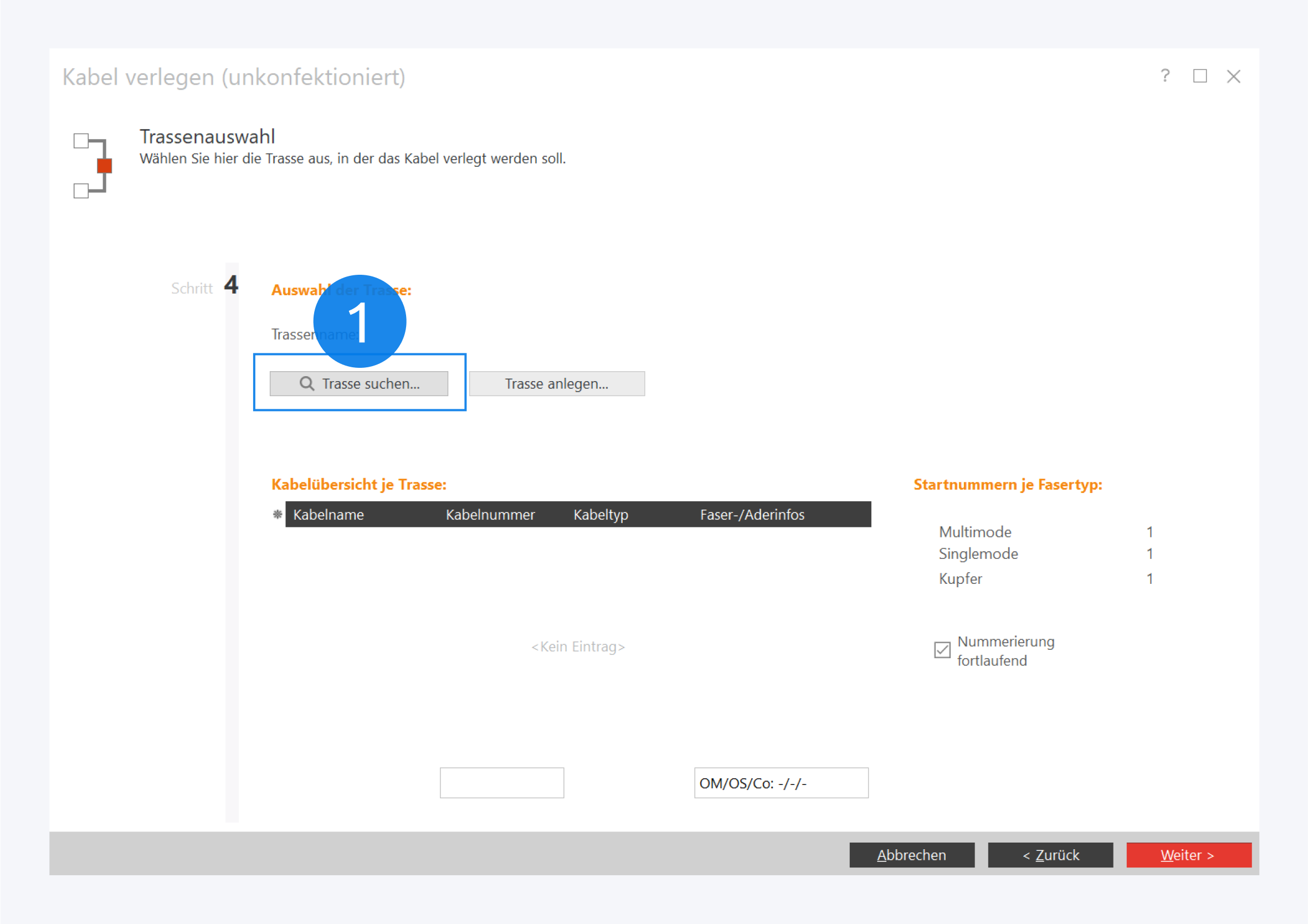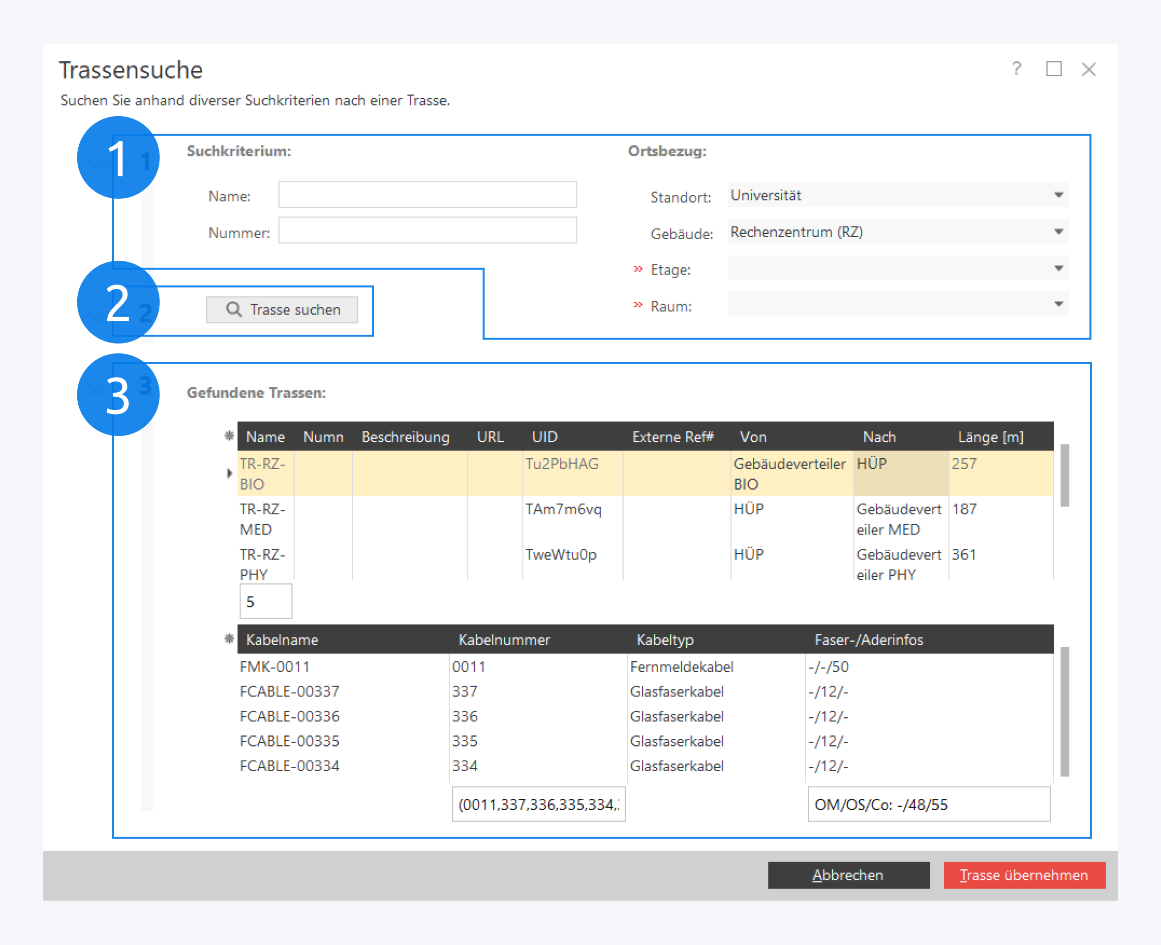 Die Trassensuche wird in Pathfinder verwendet, um existierende Trassen zu finden und Kabel in ihnen zu platzieren.