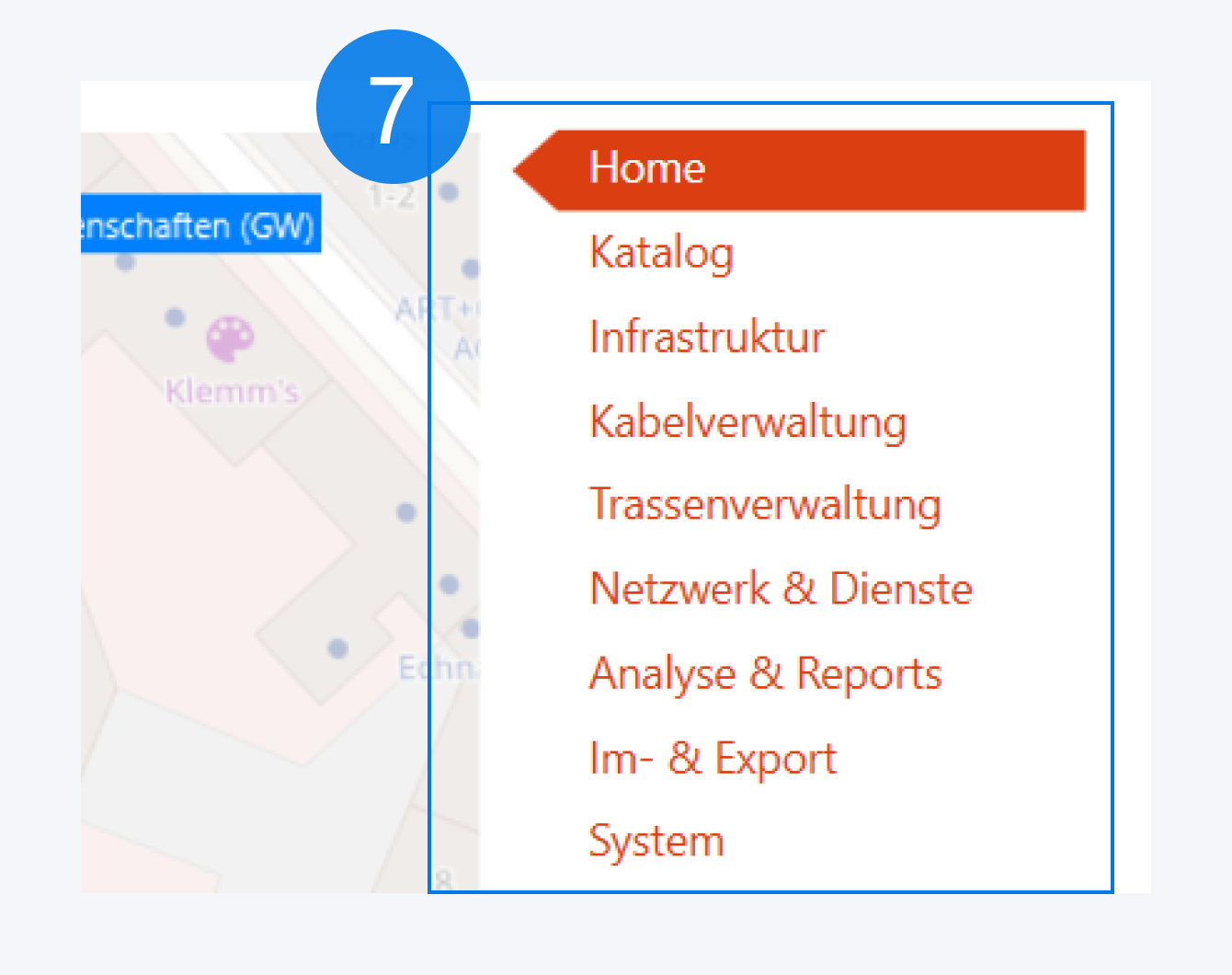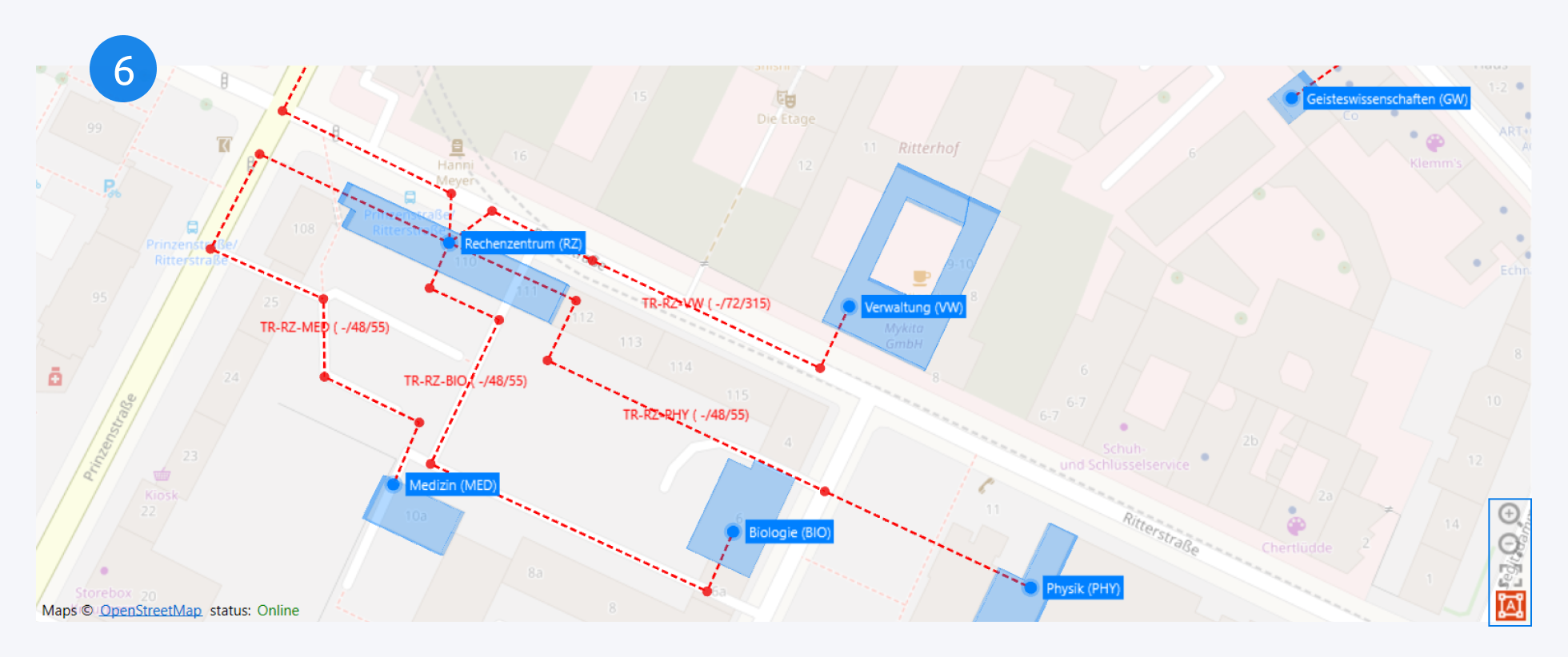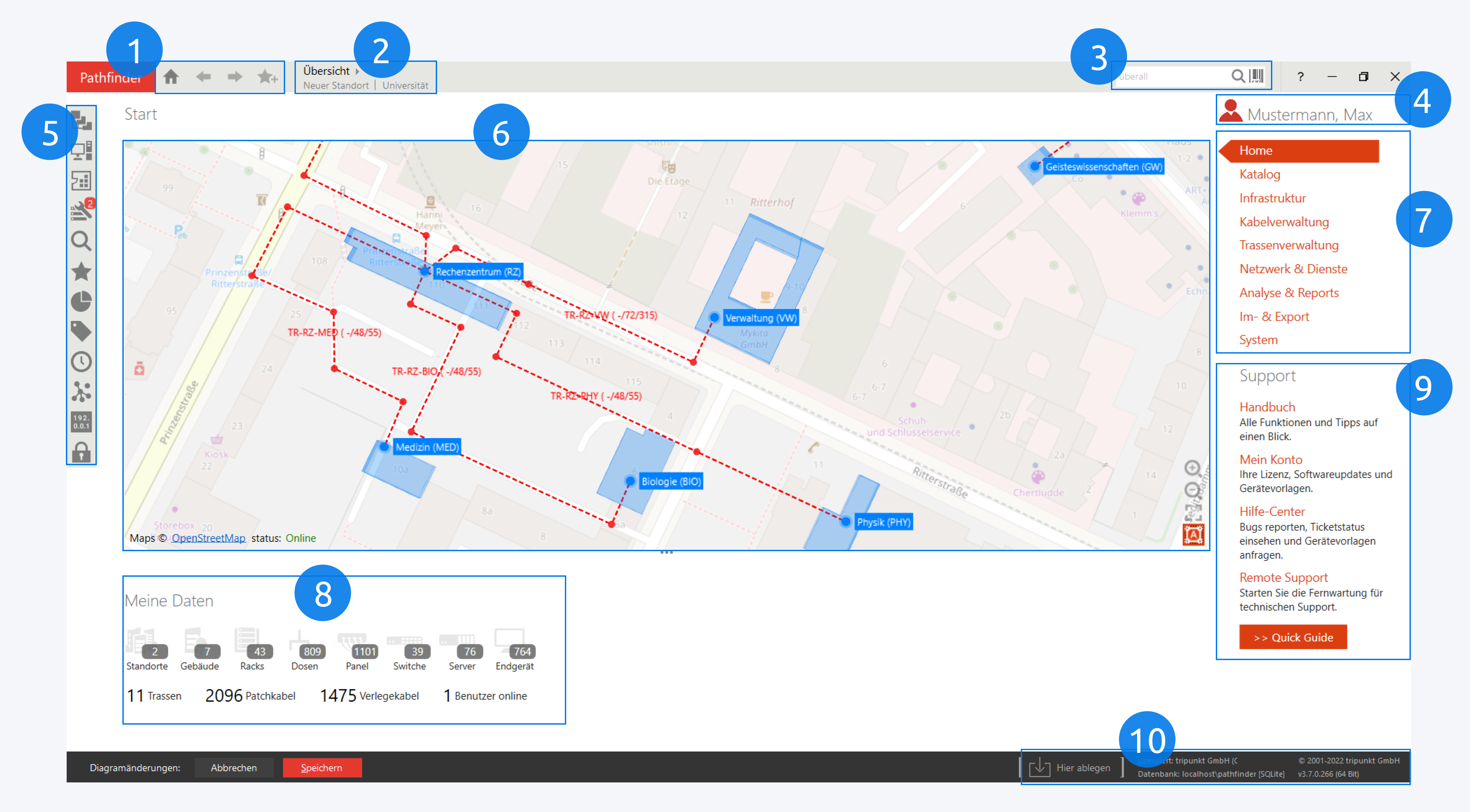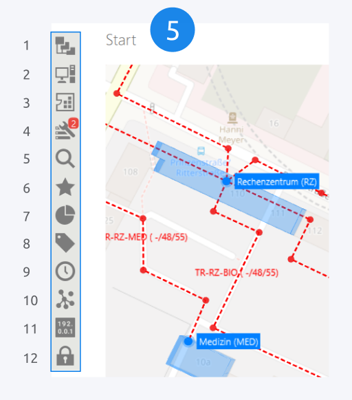Auf der Karte werden Ihre Standorte und Gebäude, sowie Verbindungen (Kabel oder Trassen) zwischen ihnen dargestellt.