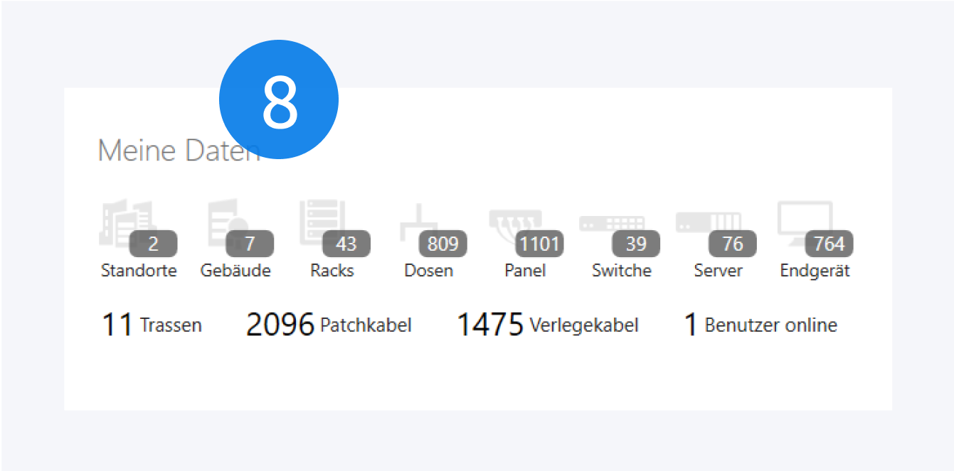 In Meine Daten am unteren Ende des Dashboards finden Sie eine Übersicht über die Dimensionen Ihres Netzwerks in Pathfinder. Ein Klick auf eines der Icons öffnet die entsprechende Instanzübersicht.