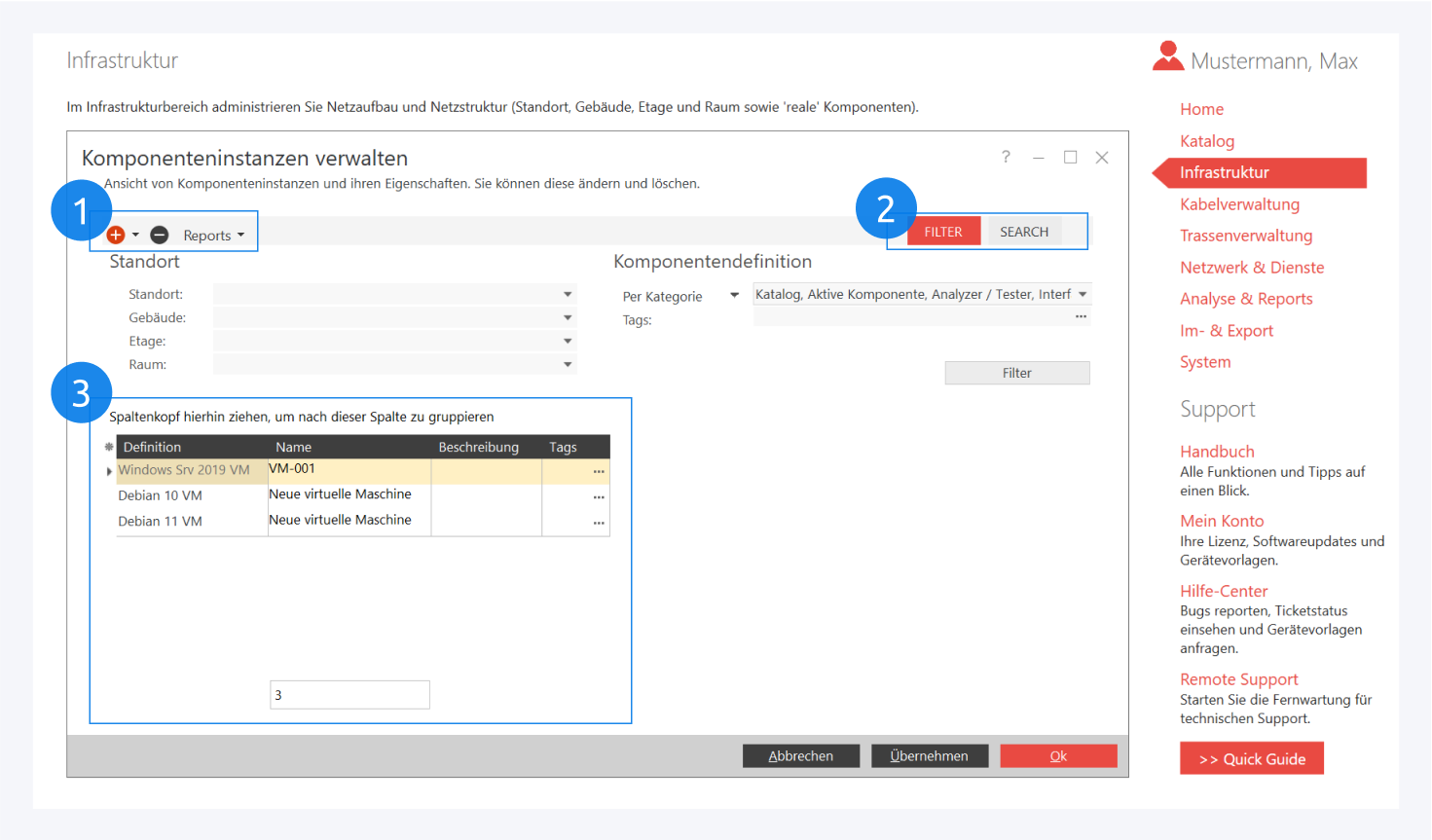 Im unteren Bereich wird die Liste aller virtuellen Maschinen angezeigt und kann bearbeitet werden (3).