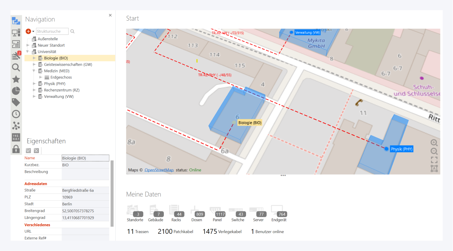 In Pathfinder werden alle Infrastrukturobjekte in einer Draufsicht dargestellt. Diese Perspektive existiert für jede Ebene vom Standort bis zum Raum, wobei es für jede Ebene spezielle Anpassungsmöglichkeiten für die Darstellung gibt.
