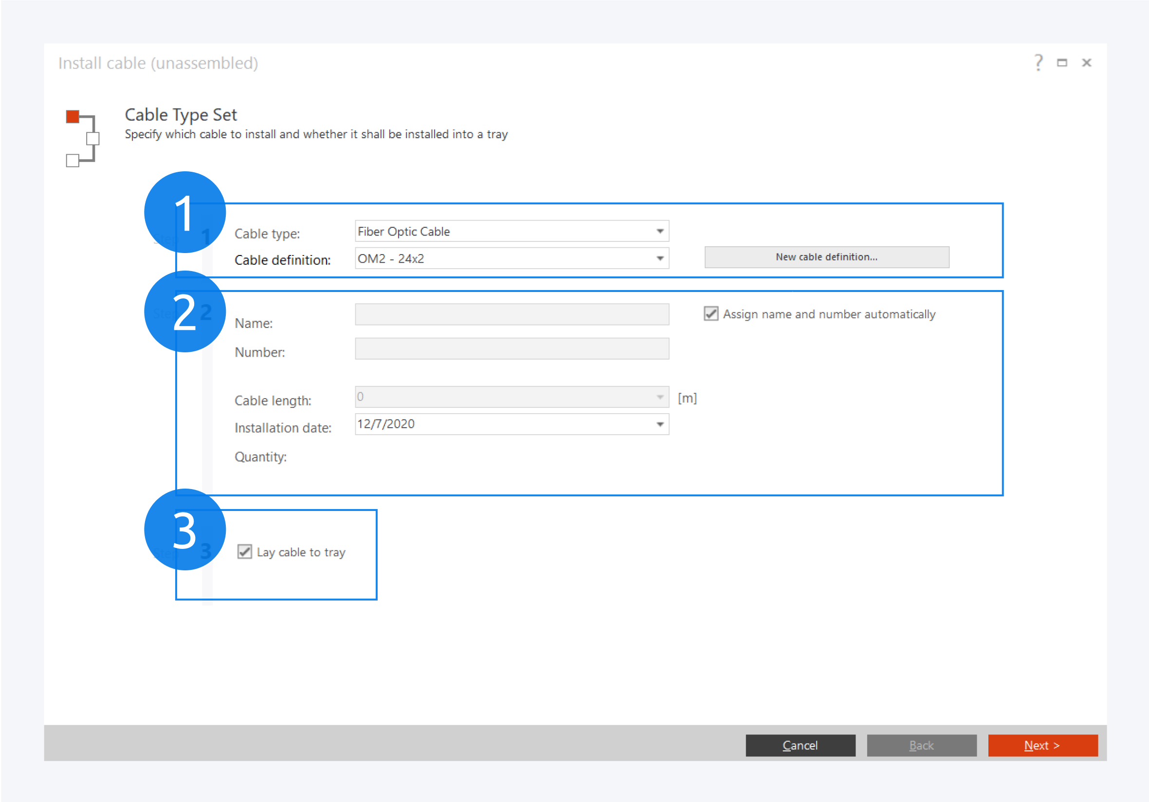 To create a new cable, first select the cable type and definition (1). If necessary create a new cable definition first. Usually, name and a number are generated automatically (2). Uncheck the box if you want to assign them yourself. Finally decide whether to add the cable in a cable tray (3).