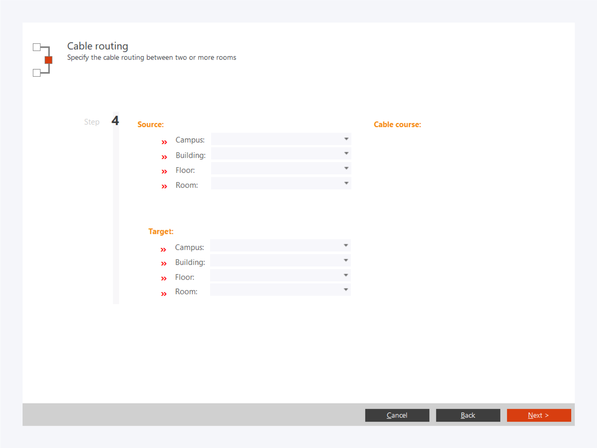 If you have chosen to install your cable without a tray, you will be asked to select the cable source and destination locations. Click on Next for an overview of your cables and click on Finish to complete installing your cable. You will be asked whether you would like to connect the cables you just installed.