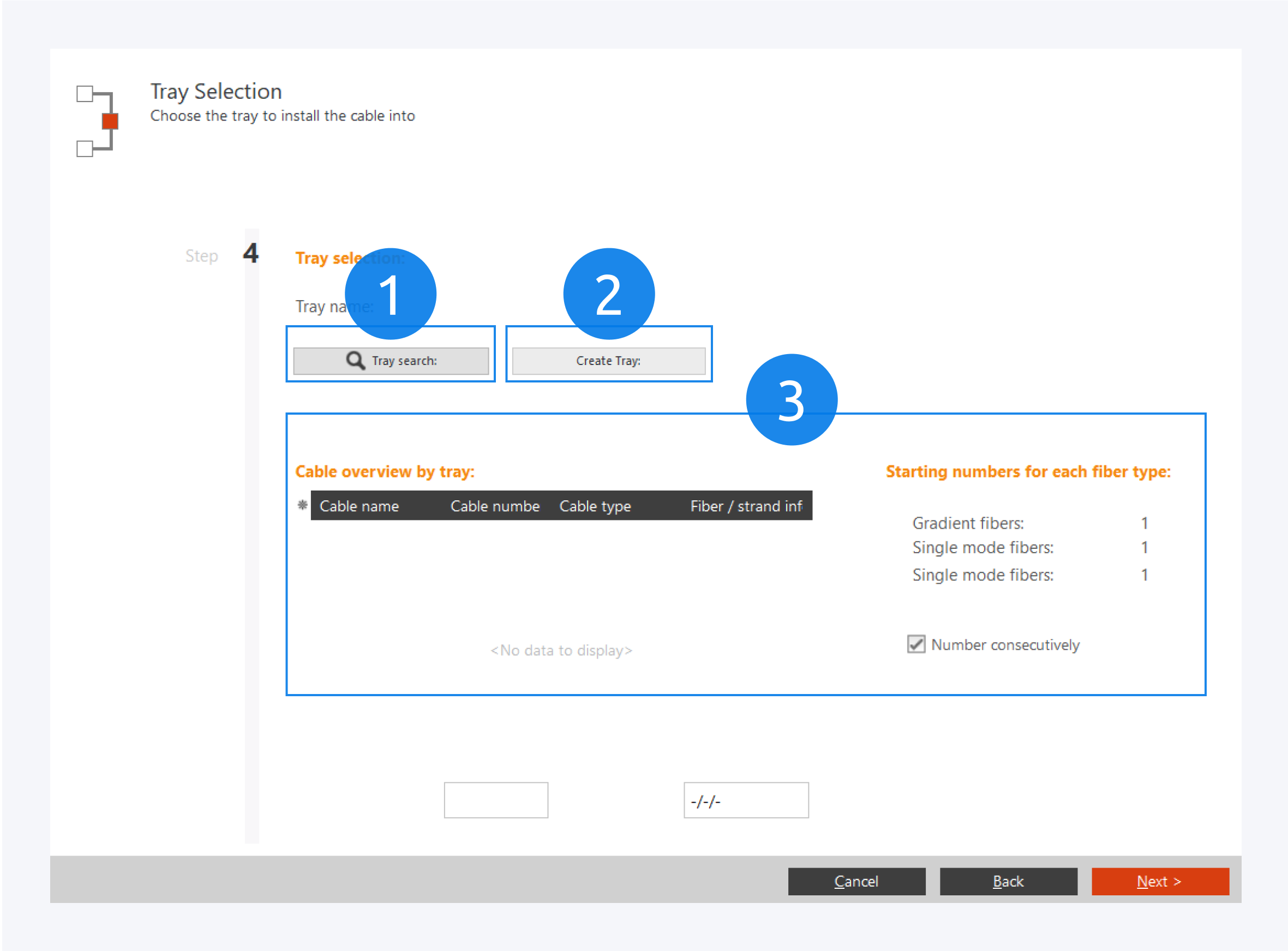 The cable overview by tray (3) shows information about the selected tray. You can also find the default starting numbers for each fiber type within the tray. Click on Next for an overview of the cable and click on Finish to complete installing your cable in the selected tray.