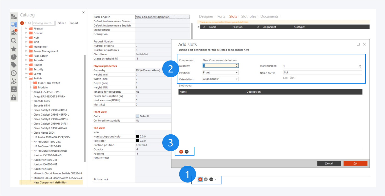 Click the add icon to add new slot definitions (1). Specify the quantity and select layout and naming options according to your needs (2). Then add at least one slot type (3). The selected slot types define which kind of modules can be built into the slots.