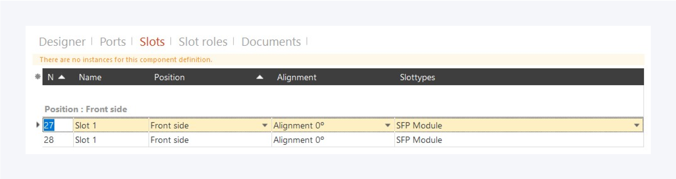 In order to manage the slots on a component definition, select the Slots tab in the component definition properties.