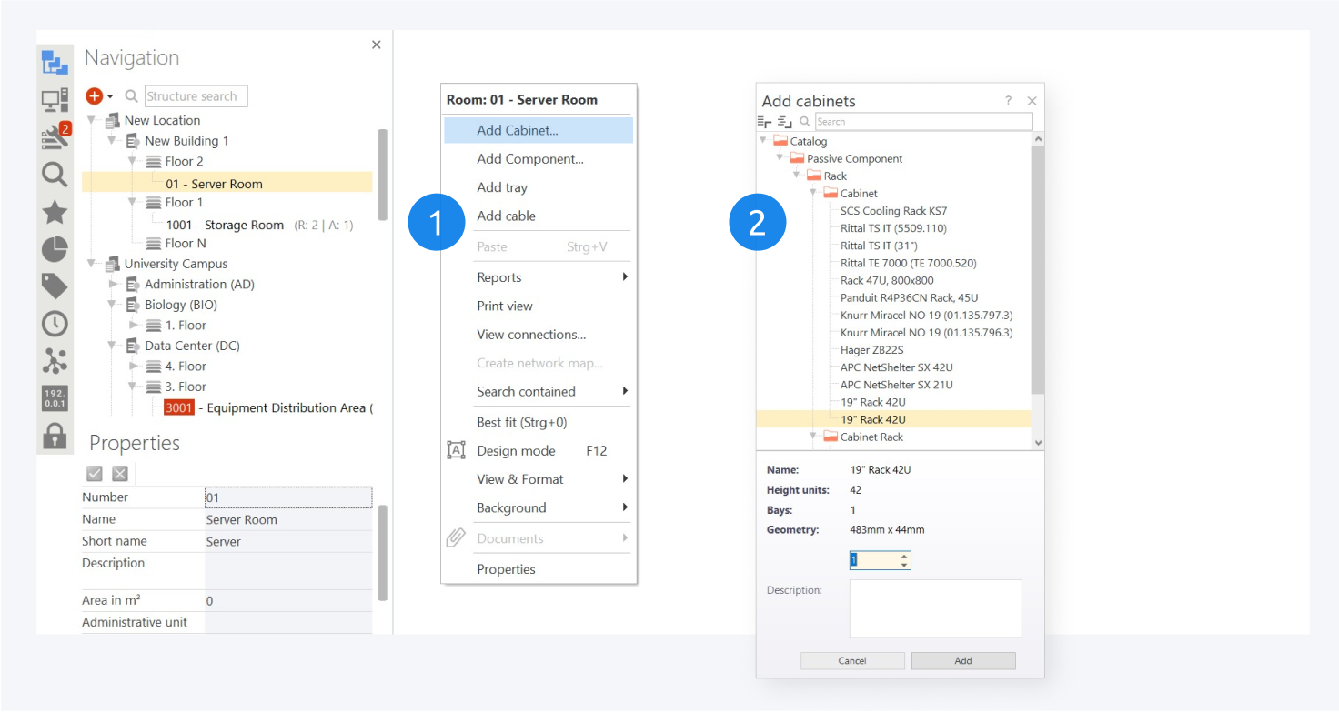 Cabinets can be created via right clicking either anywhere within a room or on a room in the navigation sidebar tab and selecting Add Cabinet (1). Select a component definition from the local catalog (2), specify the amount and click on Add to place cabinets and racks in the room.