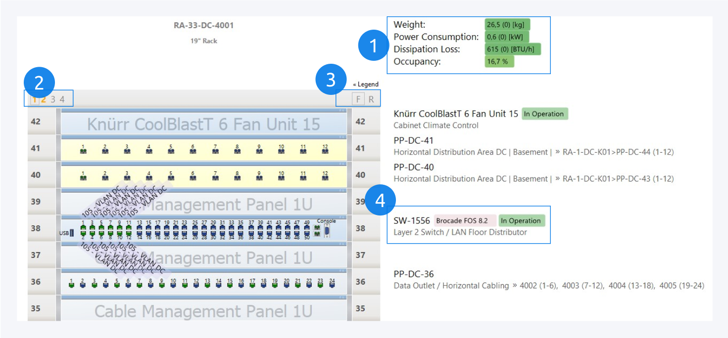The cabinet legend is shown on the top right side when inside a cabinet or rack component and updates immediately when new information is entered and confirmed. The cabinet legends provide a quick overview of the built-in components.