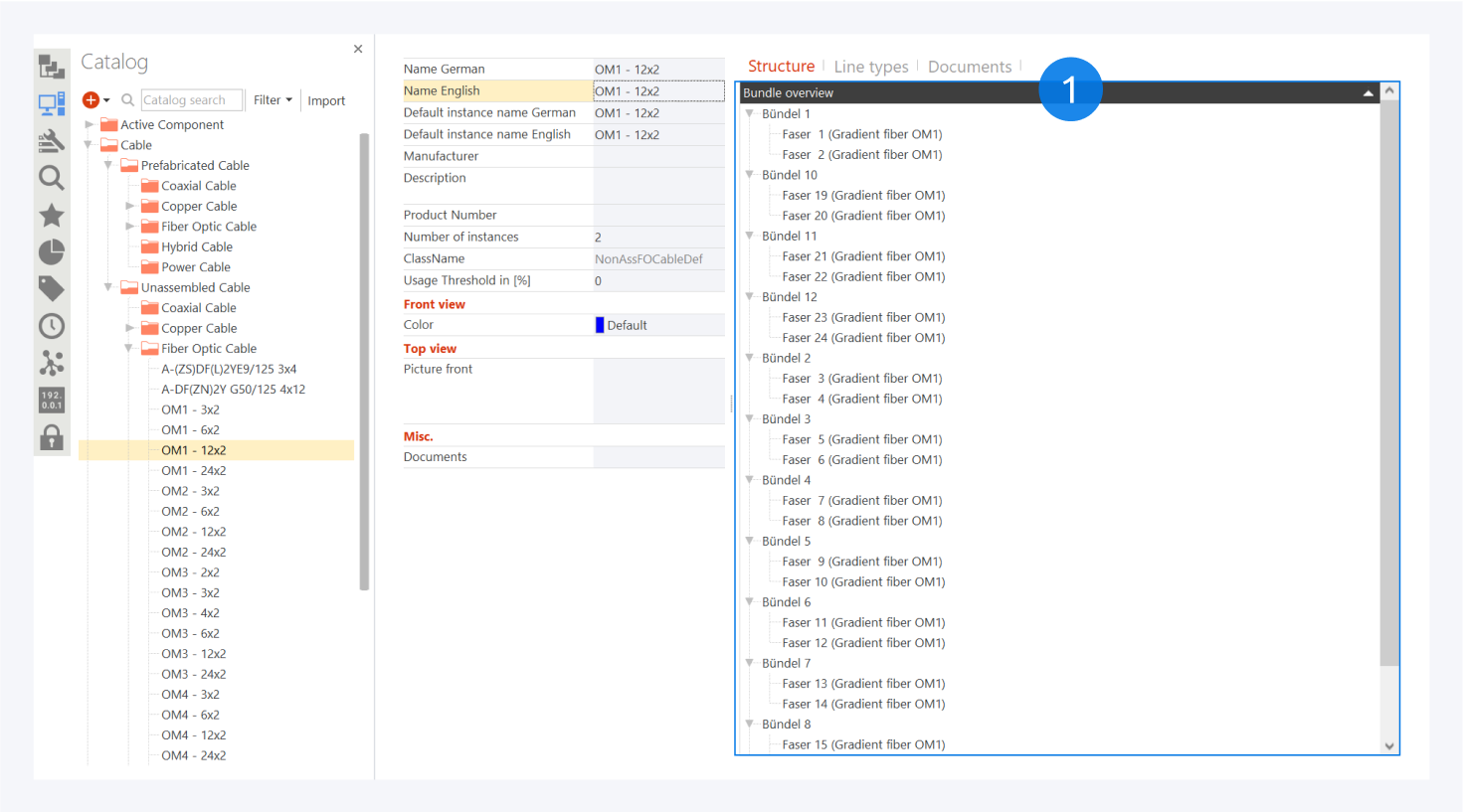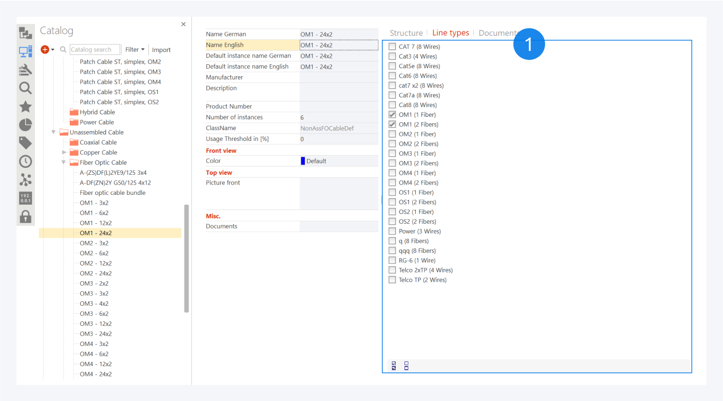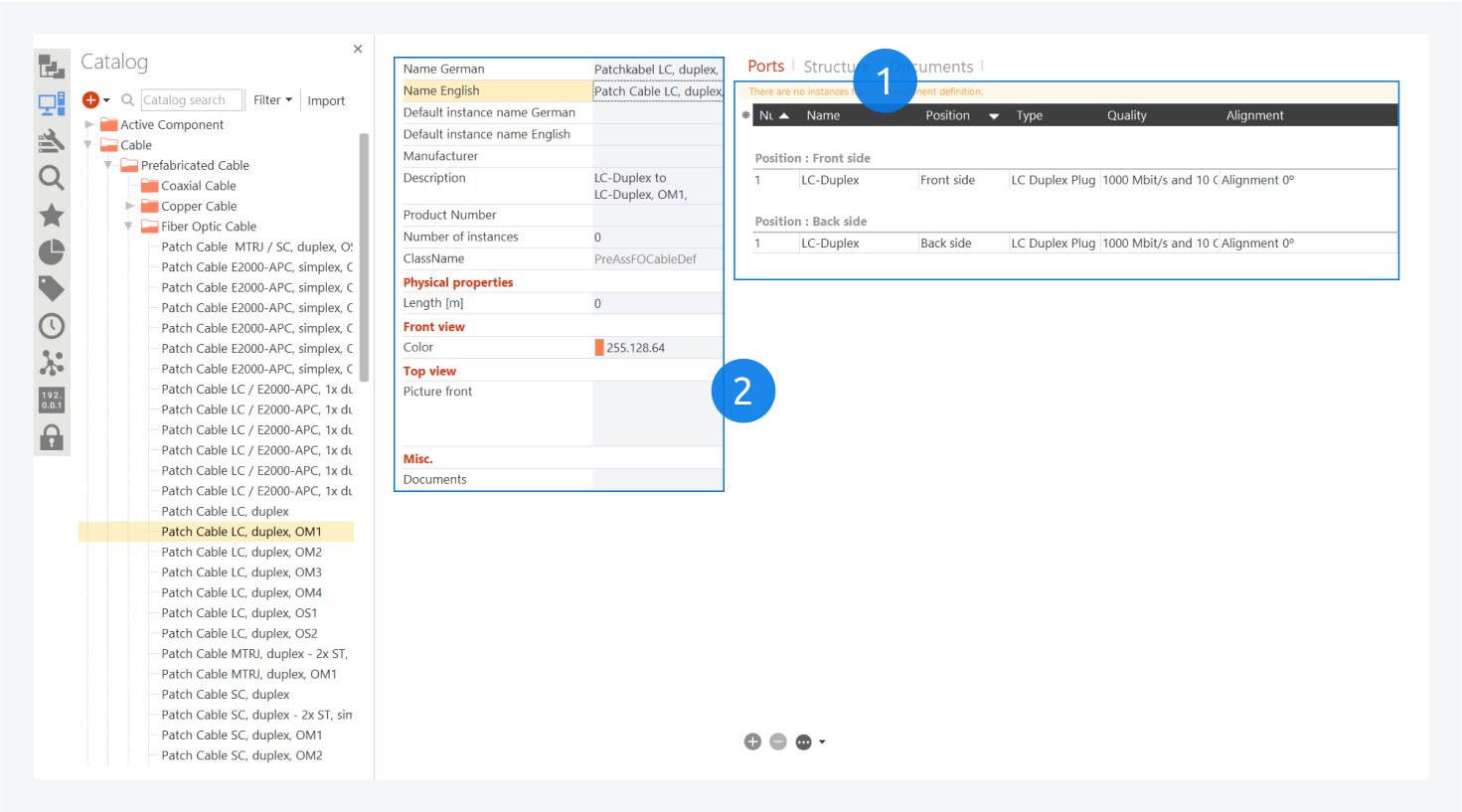 For preassembled patch cables, you can view the connector information here (1). You can change the connector name, plug type, quality and alignment for the cable definition.