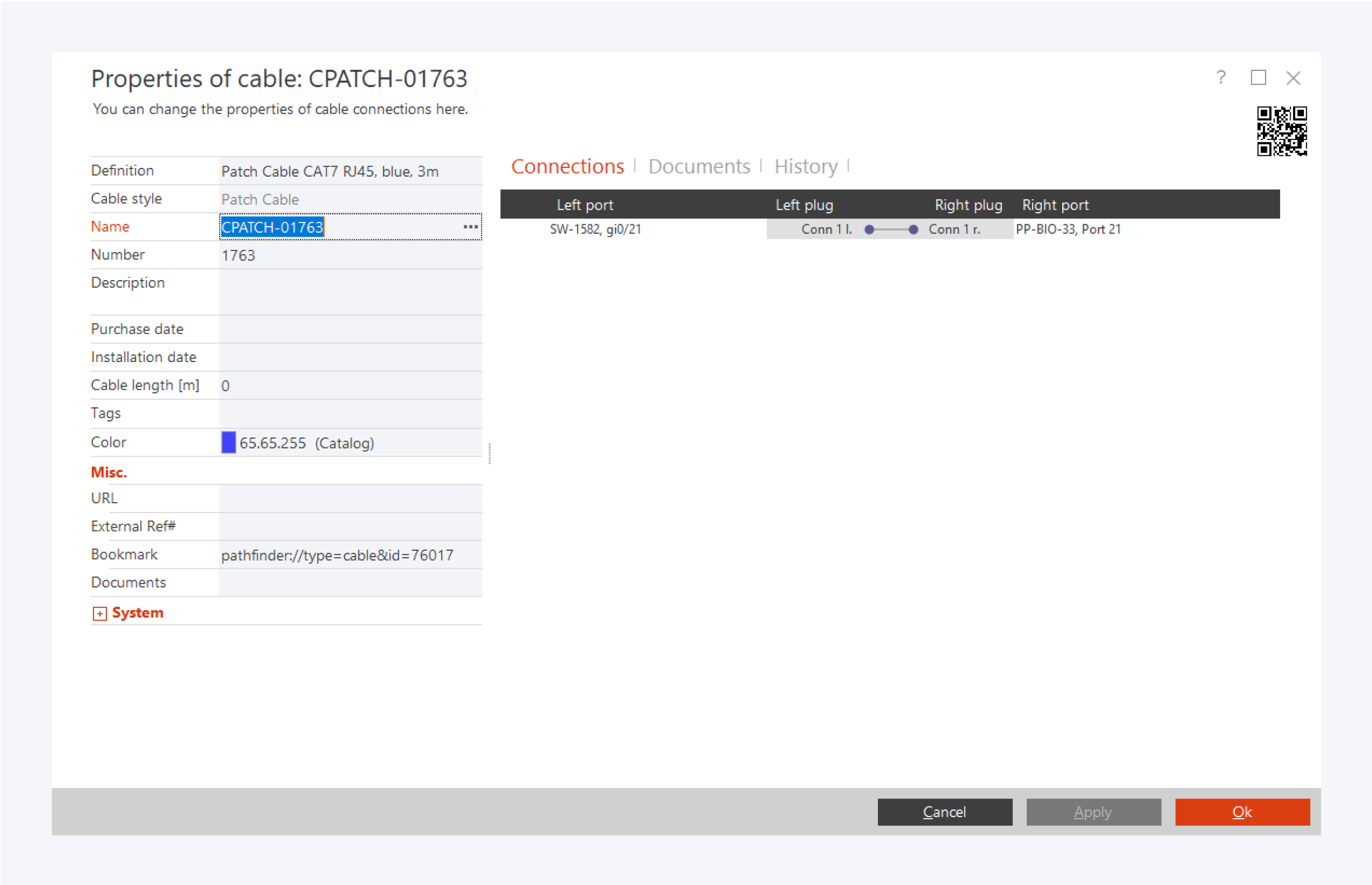 In the patch cable properties, you can view and edit the following fields: