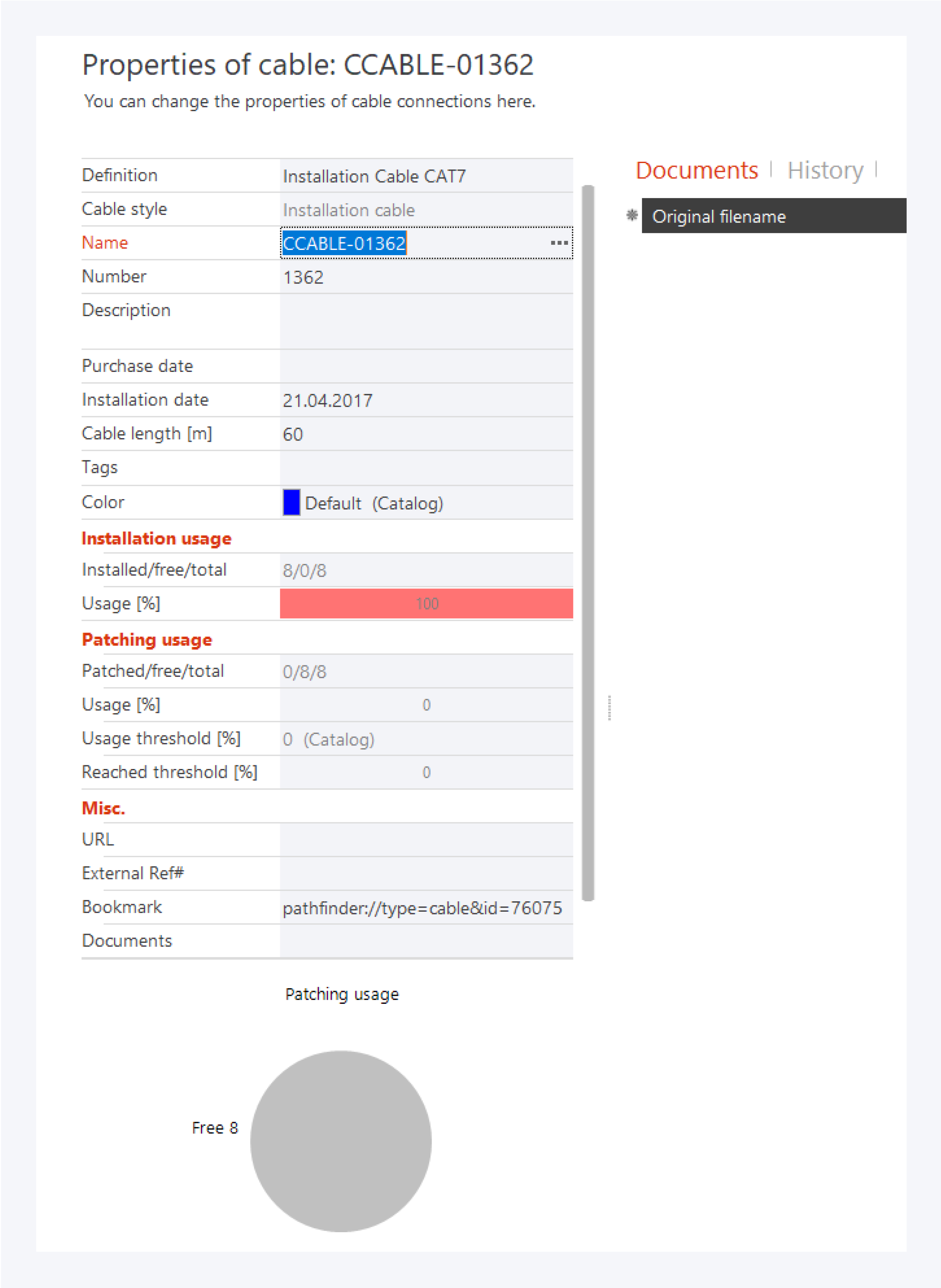 Usage [%]: Specifies the percentage of wires/fibres of the cable currently patched.