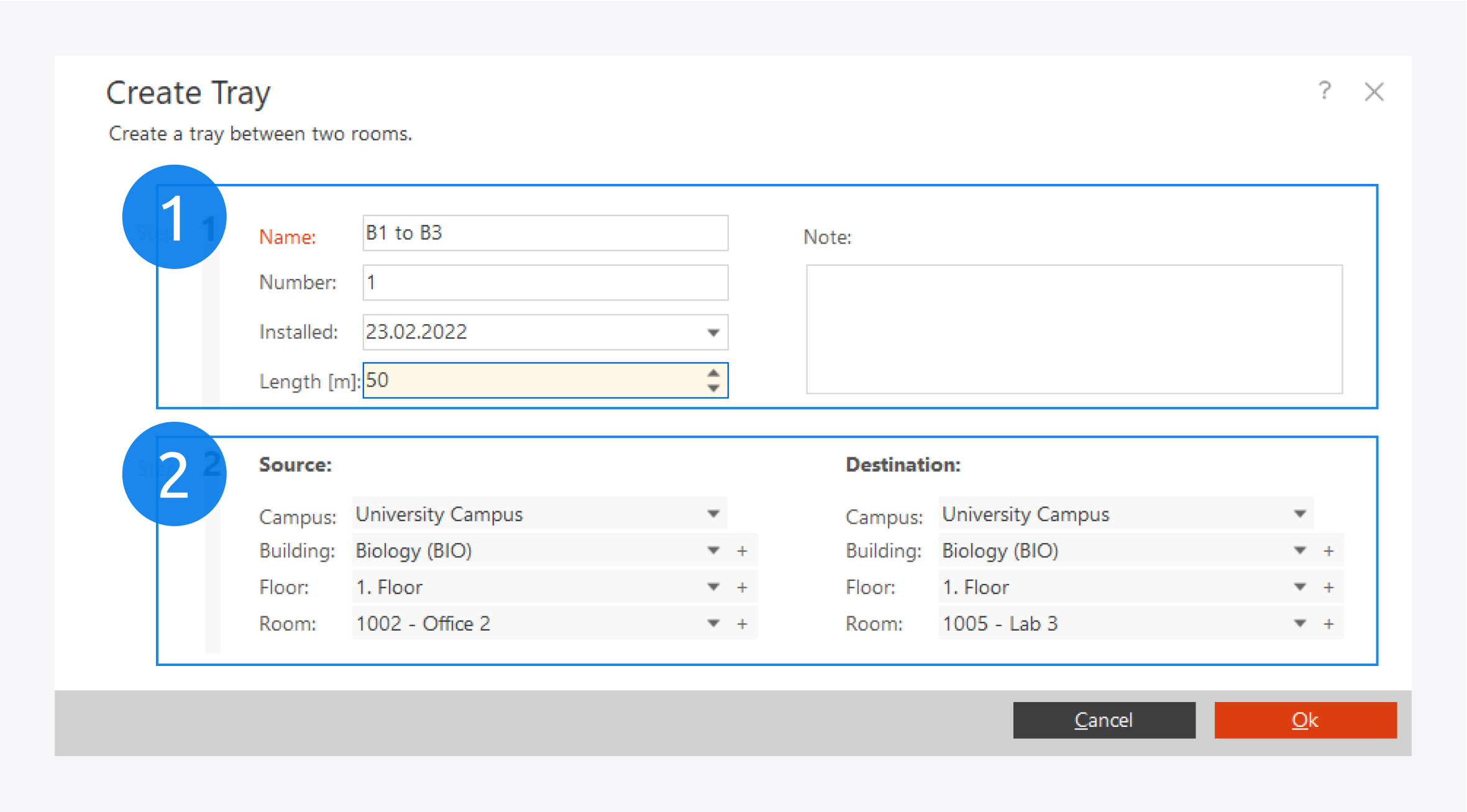 In the create tray window, you can fill out information about your tray such as a name, a number, the date of installation, the tray length and a short note (1).