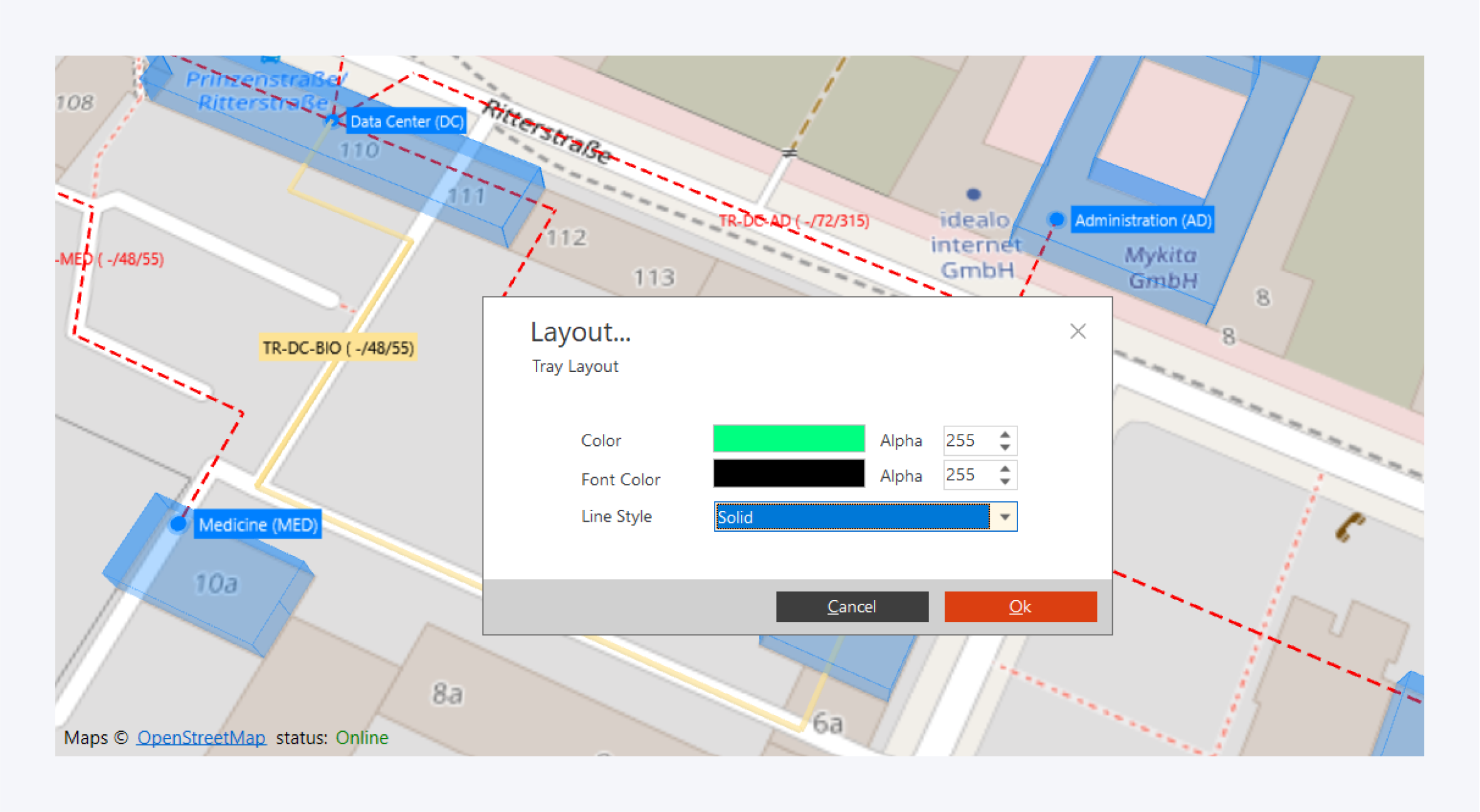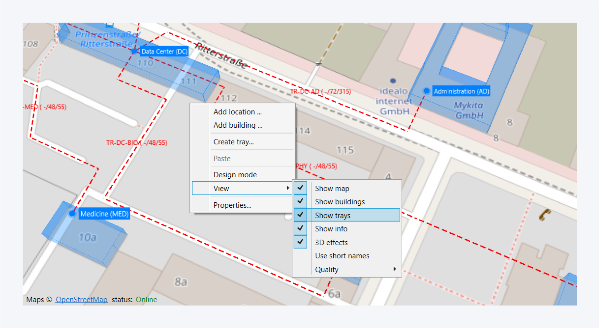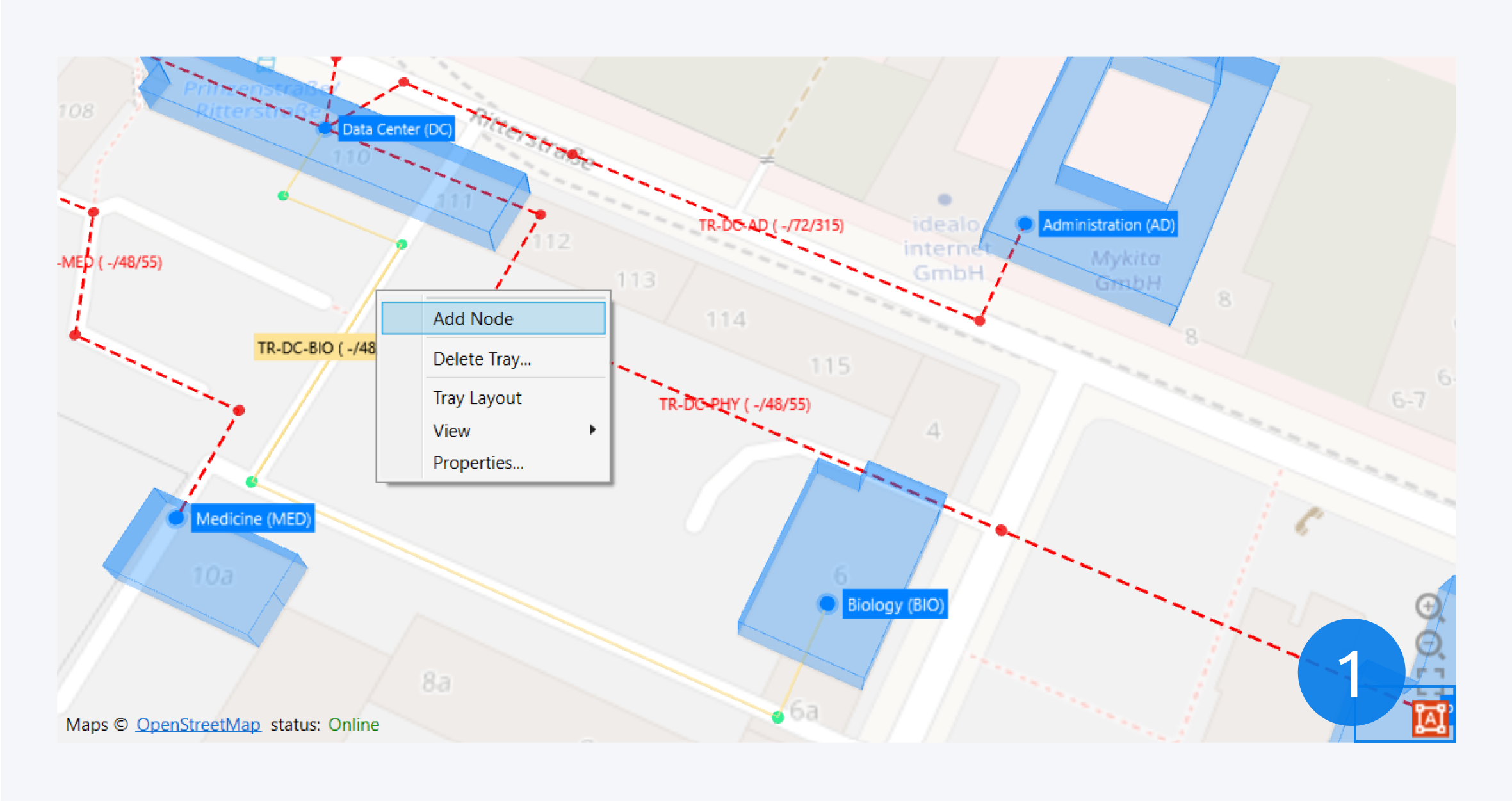 Select the Add Tray options from the tray management section or access the option in the context menus of the map or the top view of any infrastructure object from location to room.