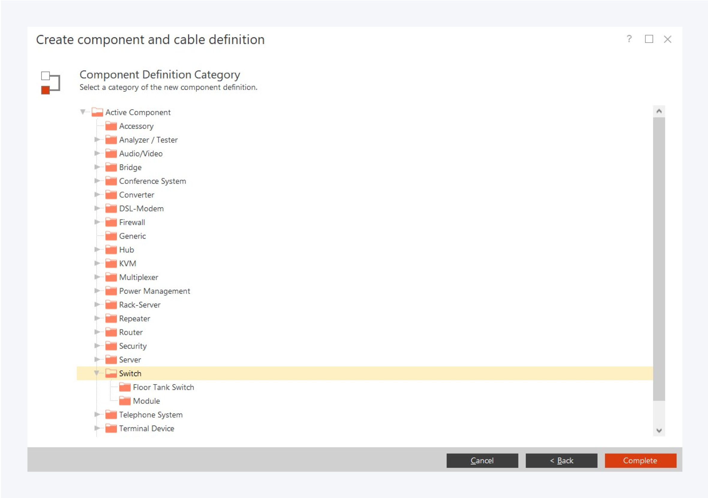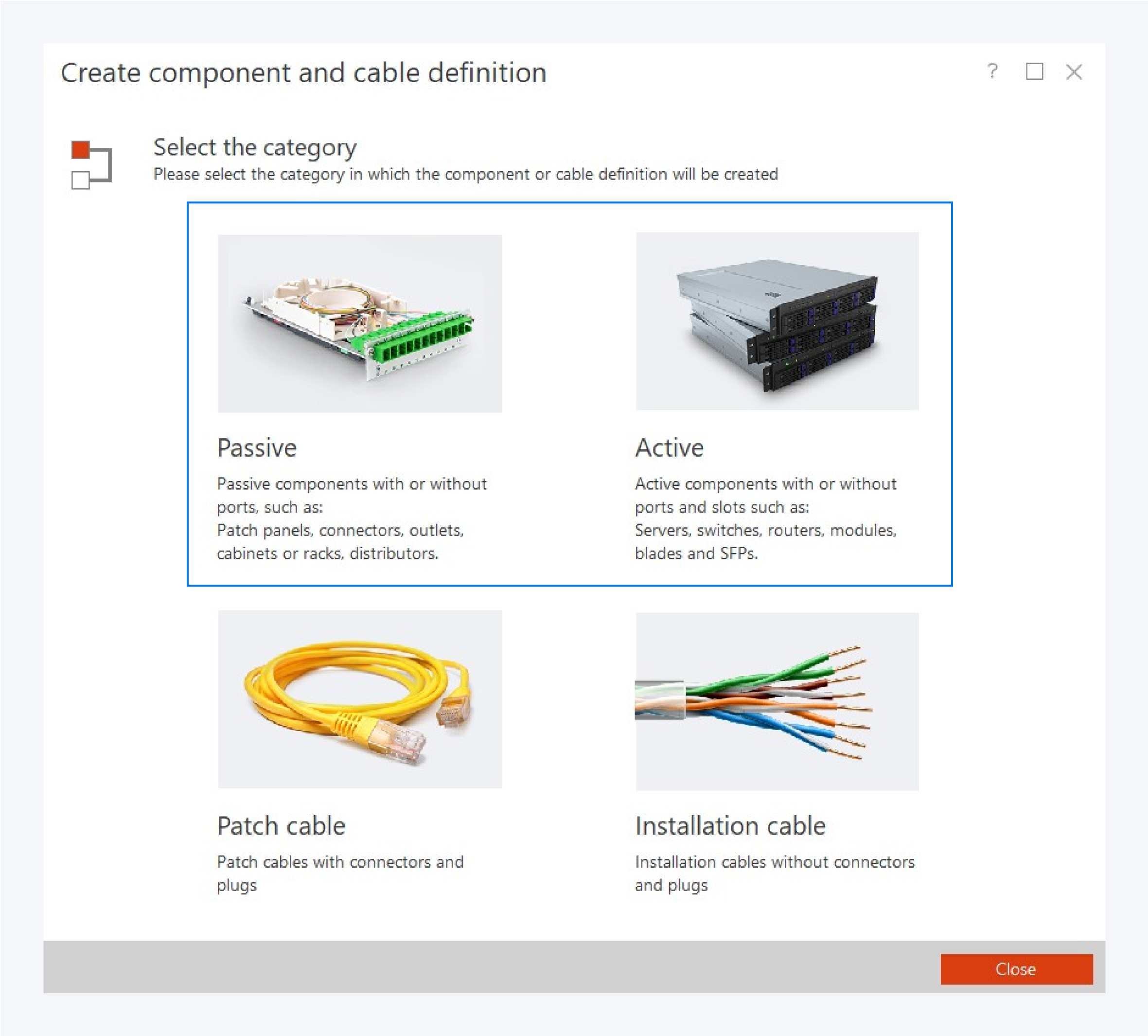 You can create passive components such as cabinets and racks, distributors, outlets, etc.