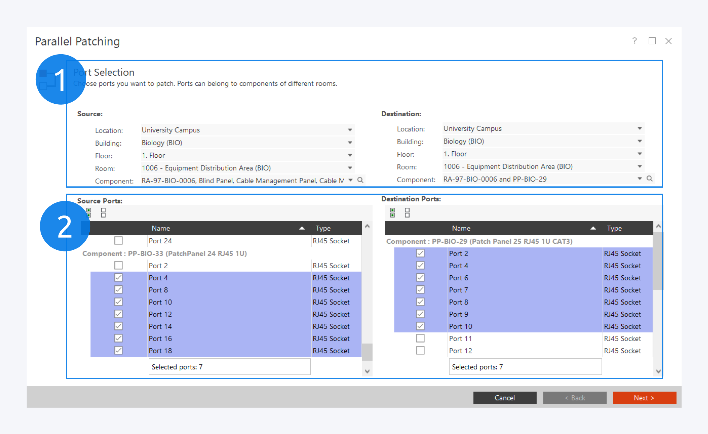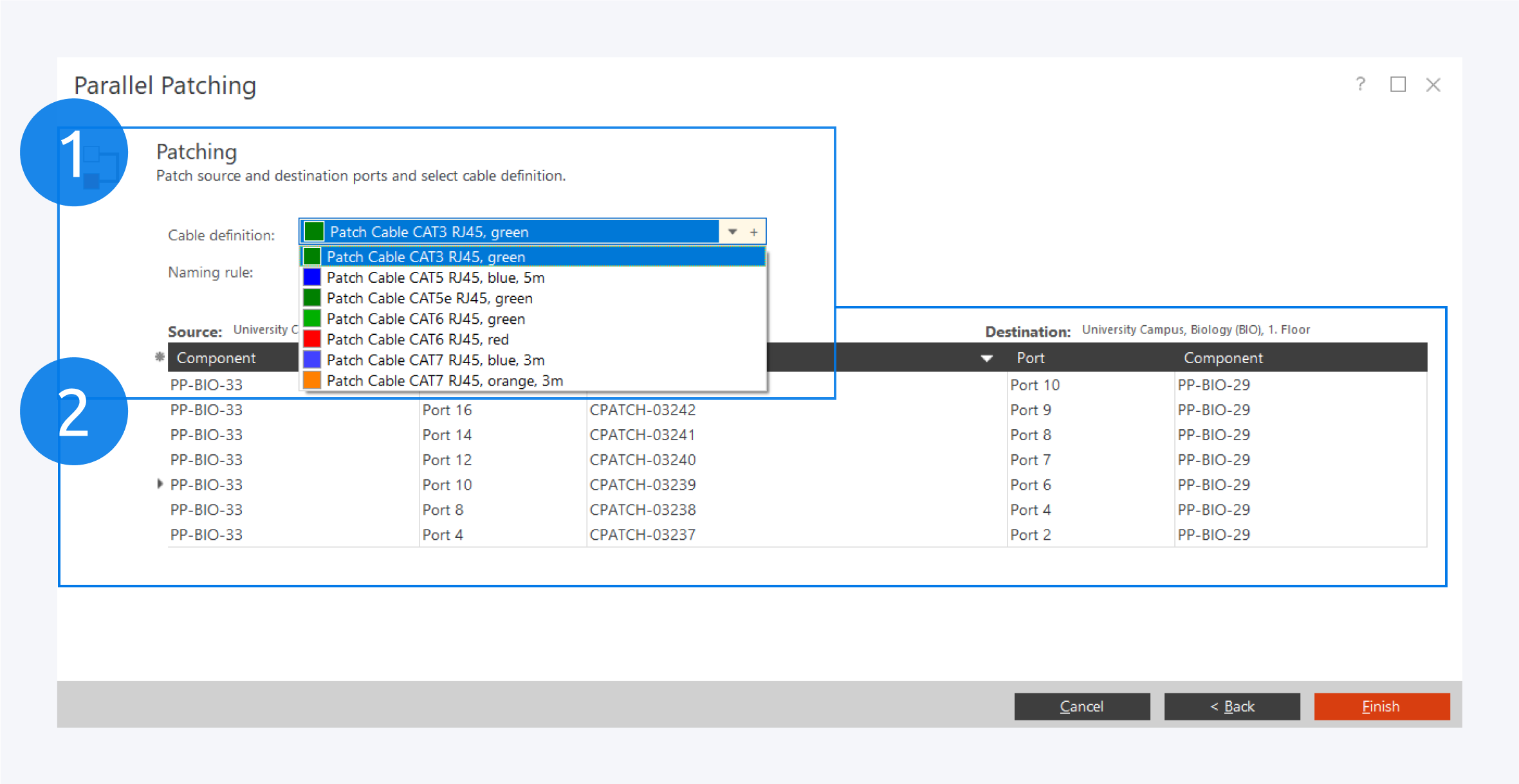 At the bottom (2) there will be a list of all new connections including the cable names. You can rearrange source and destination ports via drag&drop.
