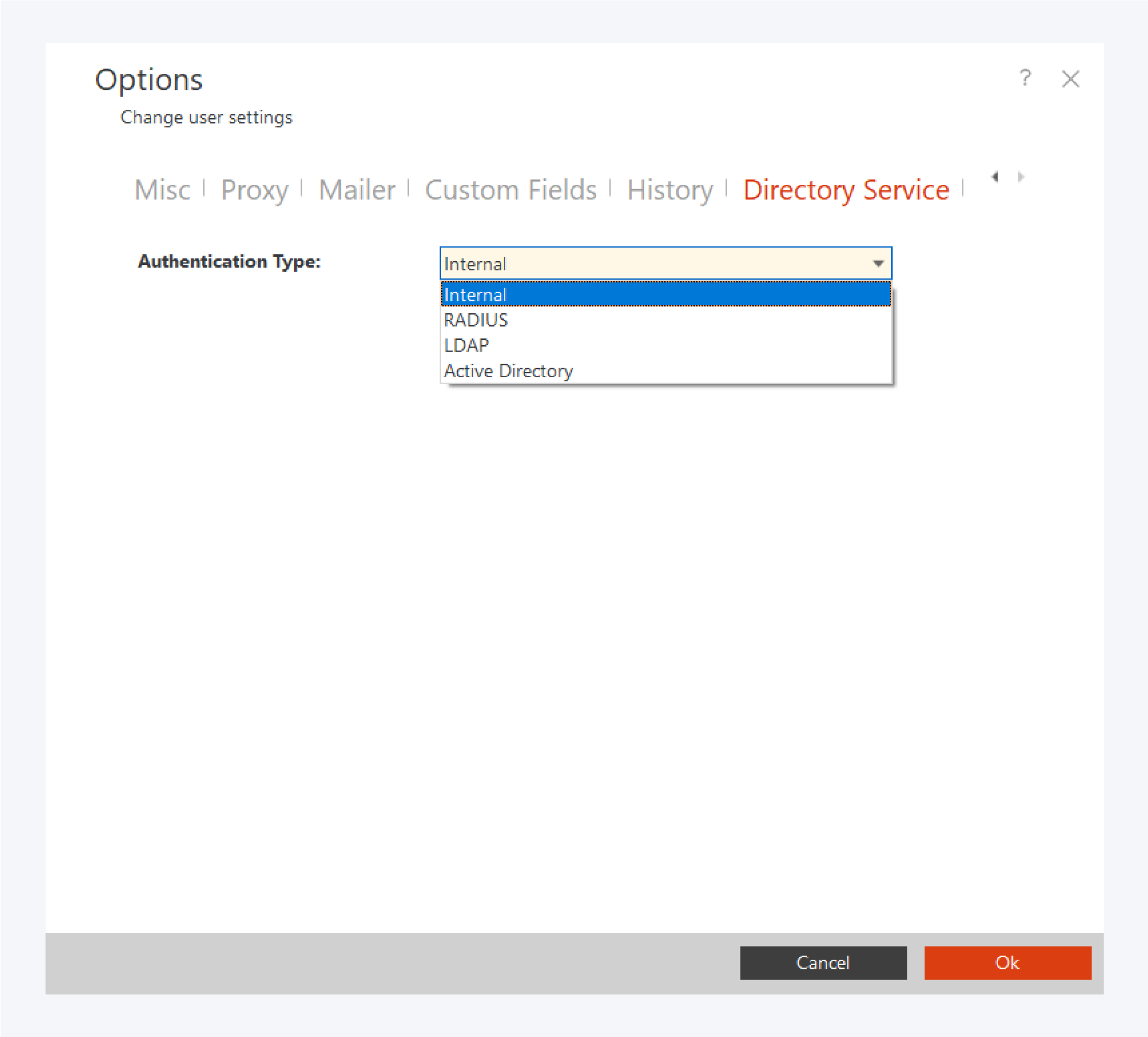 Go to the Settings section and open the Options dialog window. Go to the Directory Settings tab and select the authentication type.