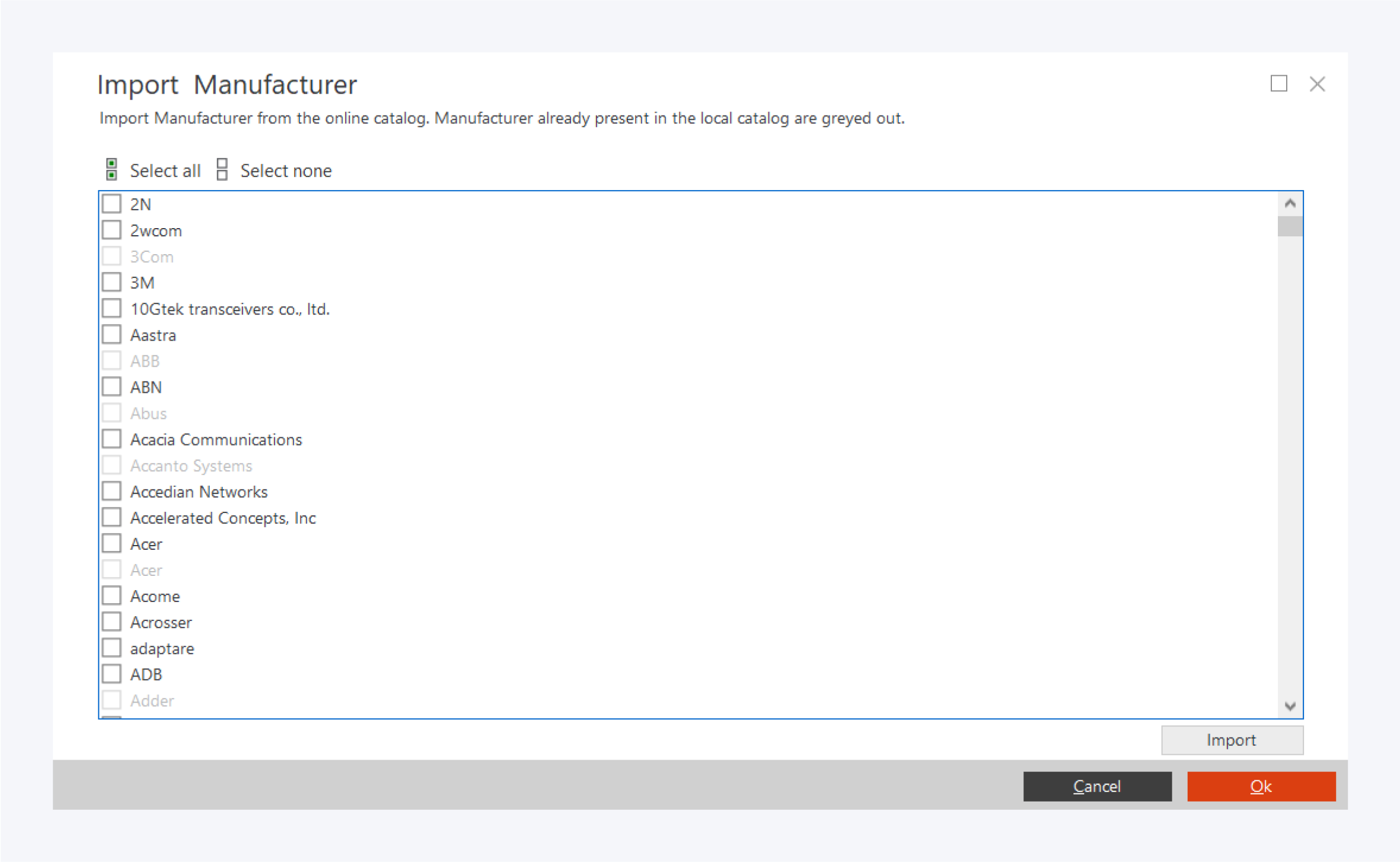 In the import manufacturer window, select the vendor information you need and click on Import and OK.
