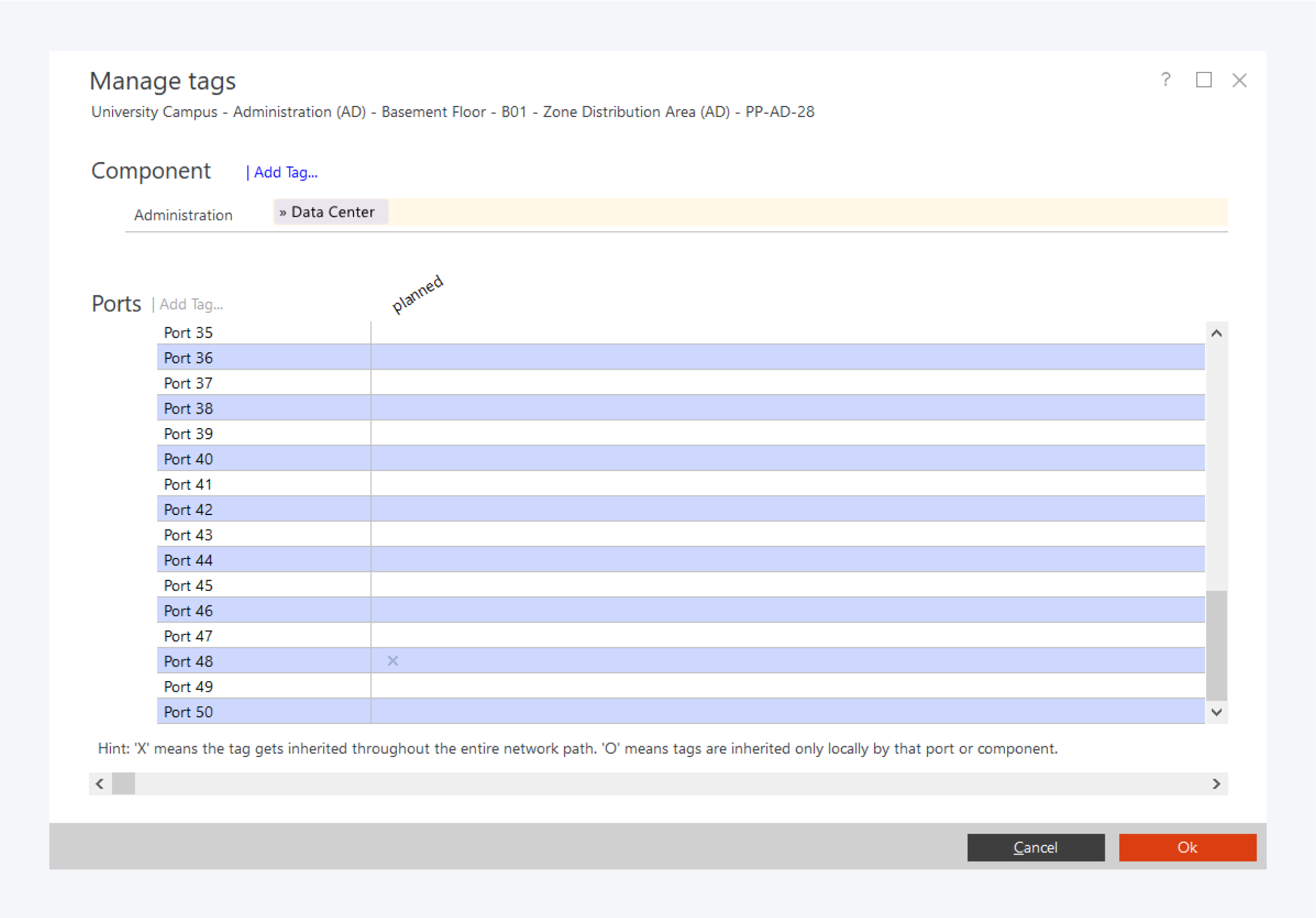 In the manage tags dialog window, you can add, delete and edit tag information for components and ports.