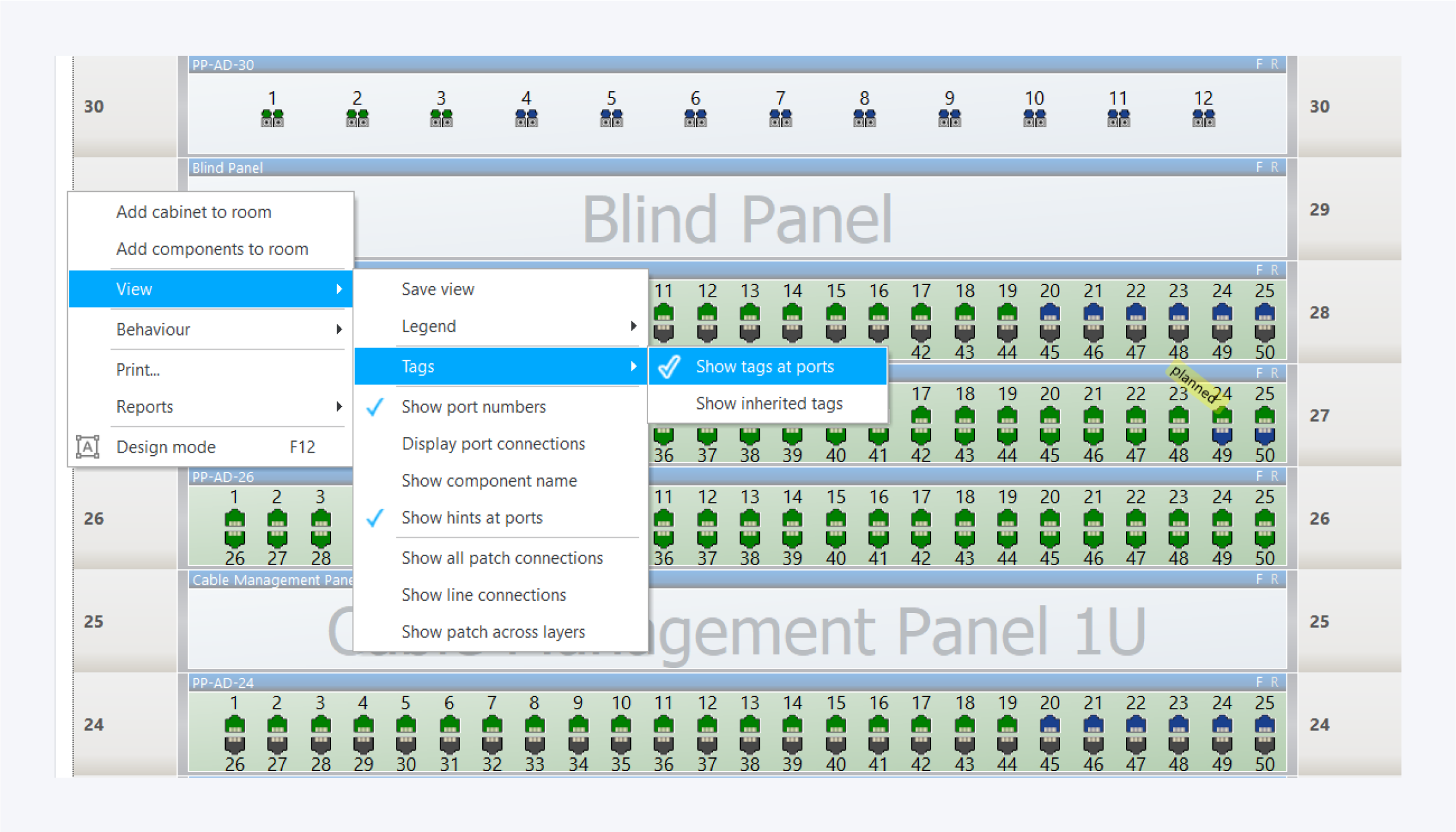 You can enable or disable the tag information displayed on the components and ports from the rack’s context menu.