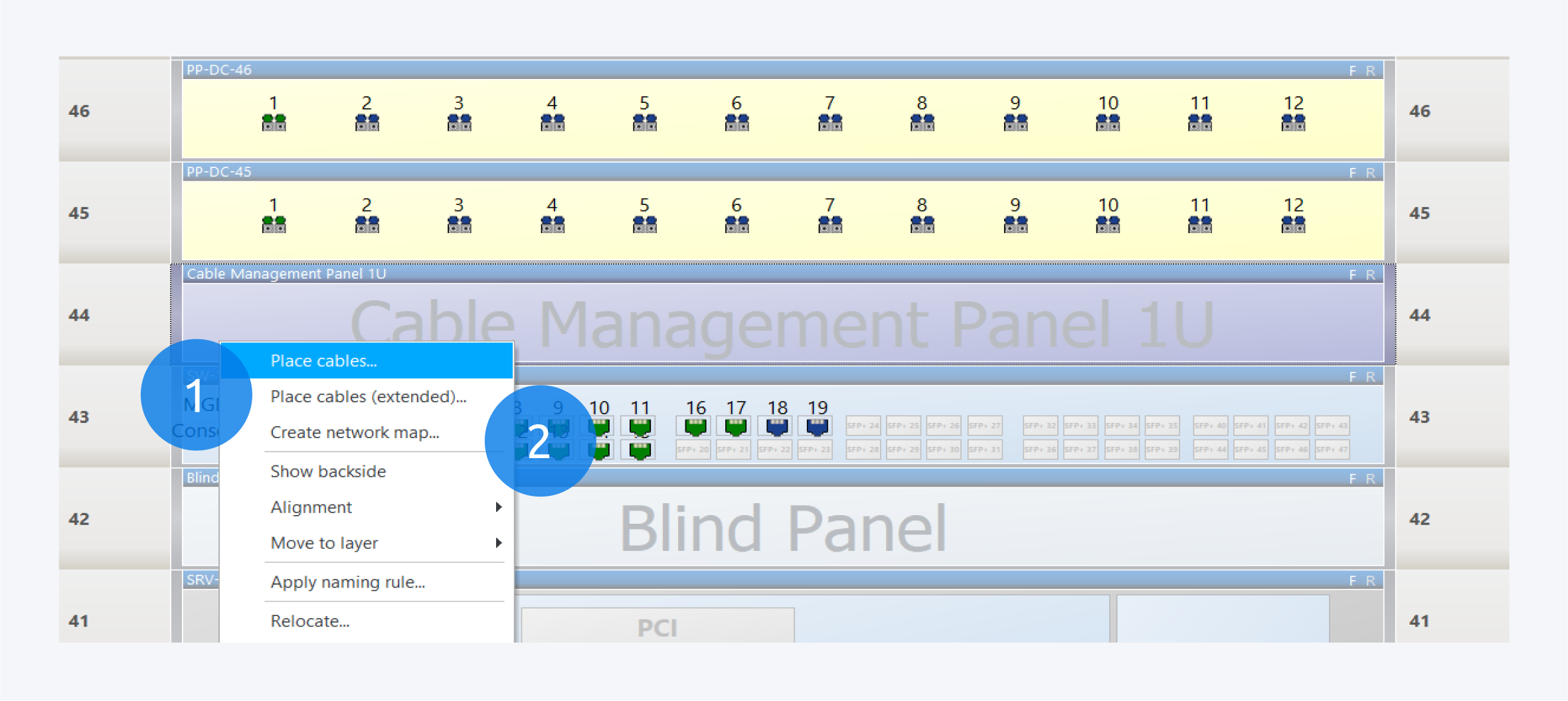 Right click on a component and click on Place cables (1) to start the permanent cabling process.