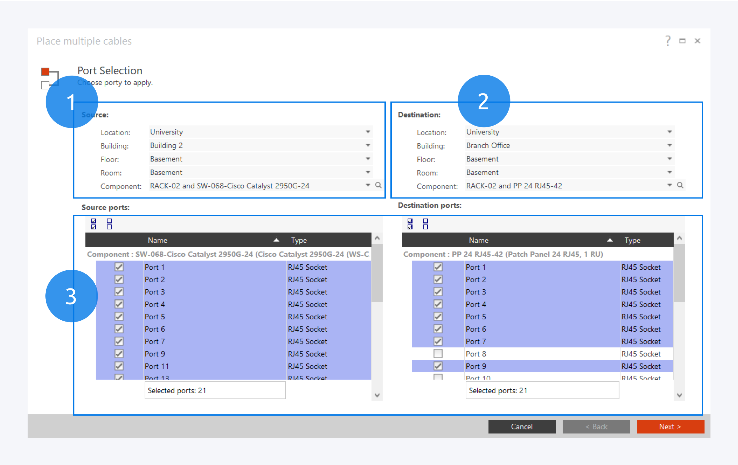 After you have selected your source and destination components, the available ports will be shown below (3). Select the ports you want to connect between your components and click on Next. The selected ports for the source and destination must be same amount.