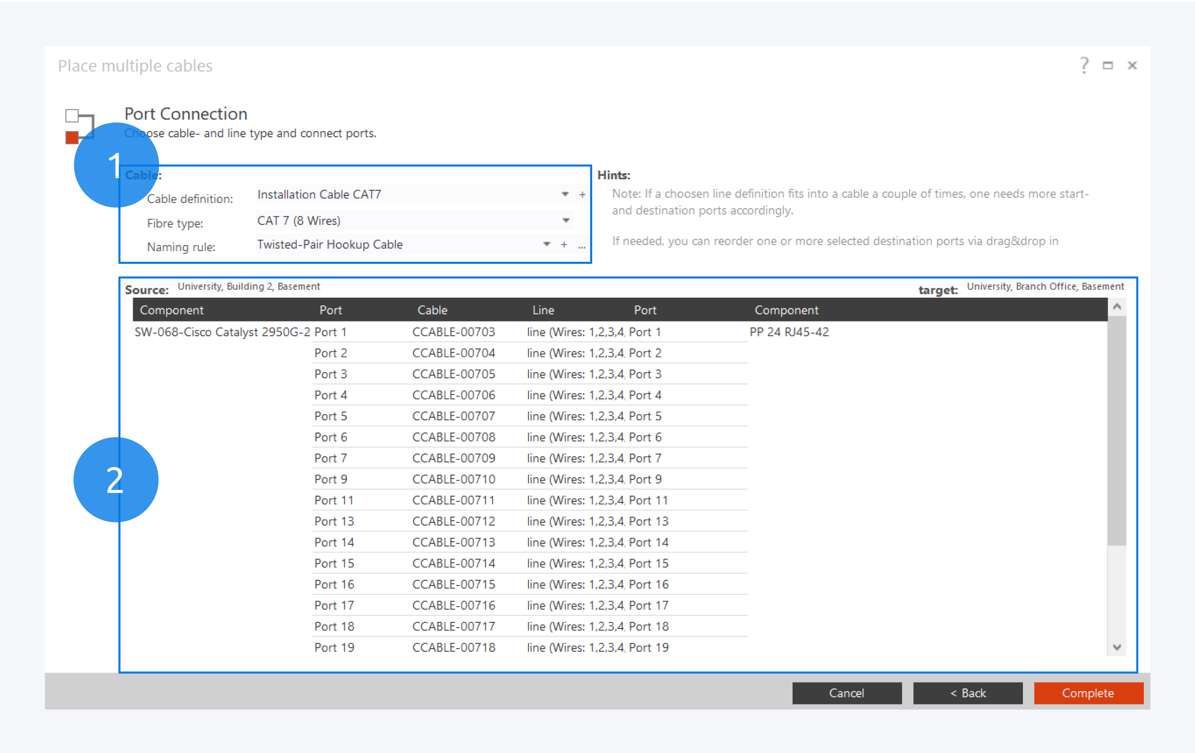 You can change the port to port connections of your components here (2) by dragging and dropping the source or destination ports to the corresponding column. After reviewing the connections, click Complete to finish the permanent cabling process.