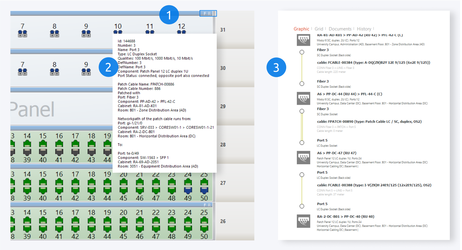 Double clicking on a port will show a graphical and grid view of the network path if the port has a cable connection.