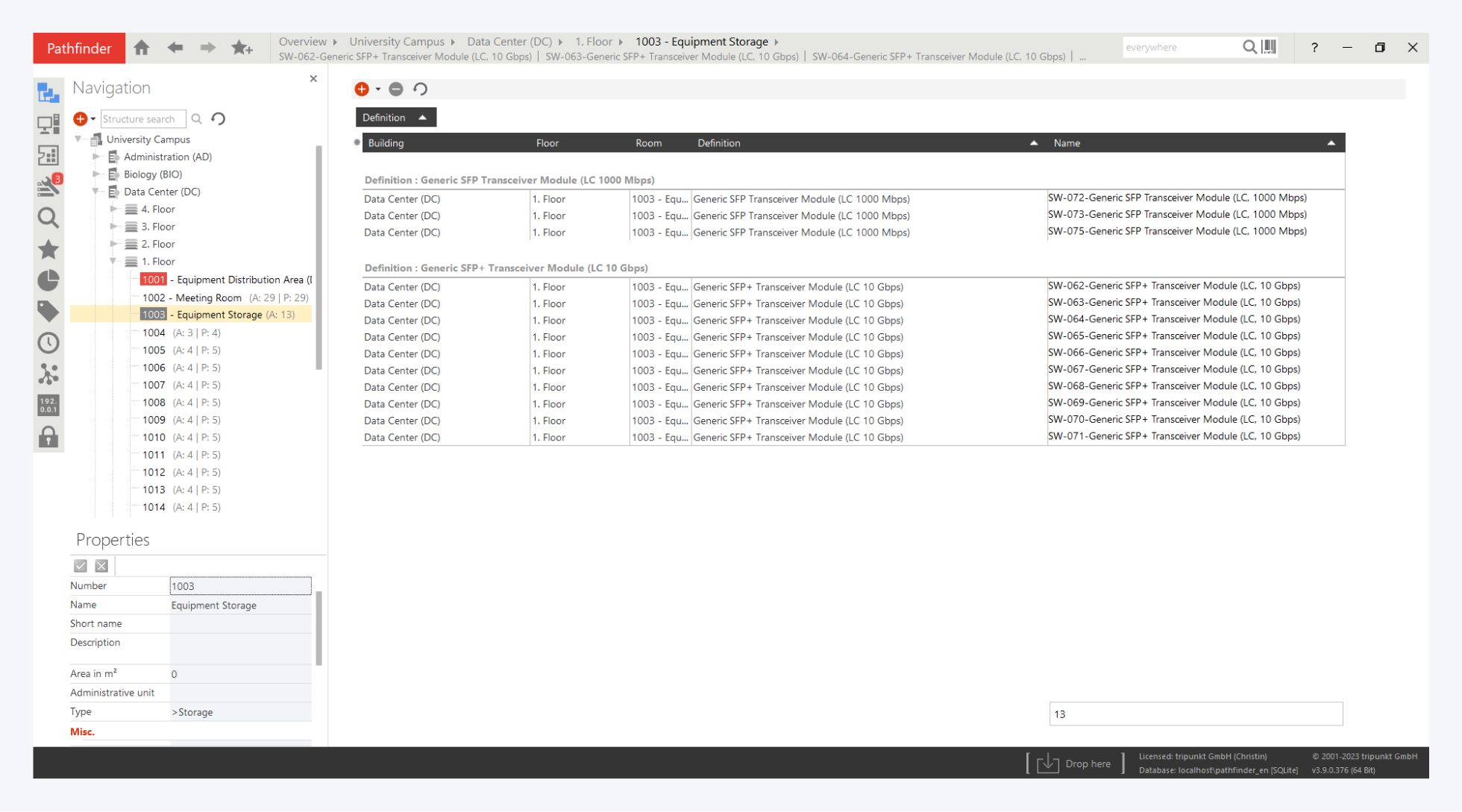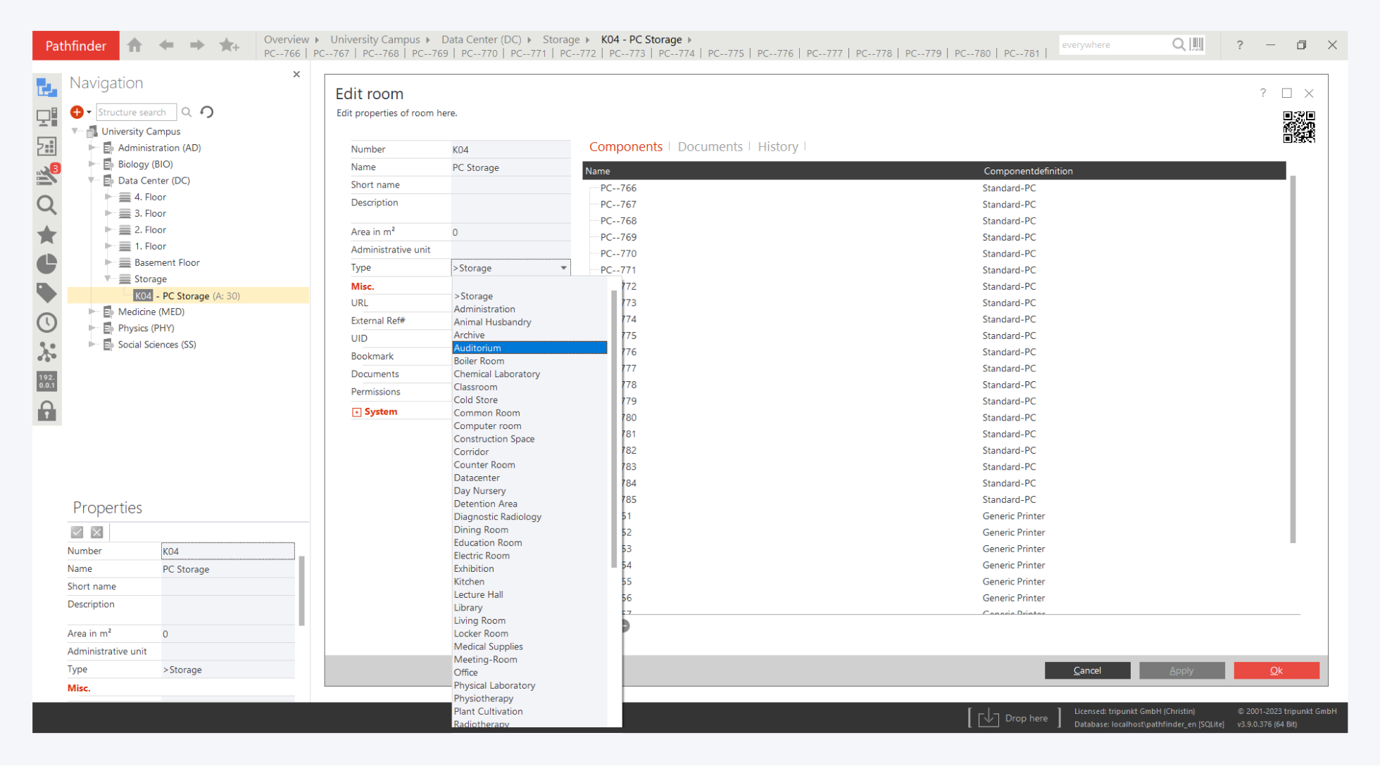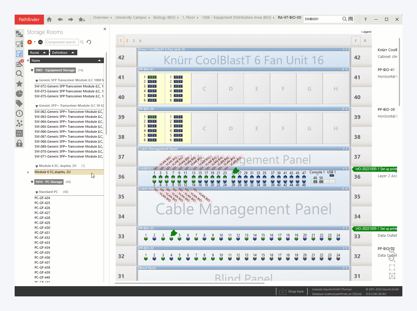 Components can be moved from the storage management in the sidebar to a rack or room by drag & drop.