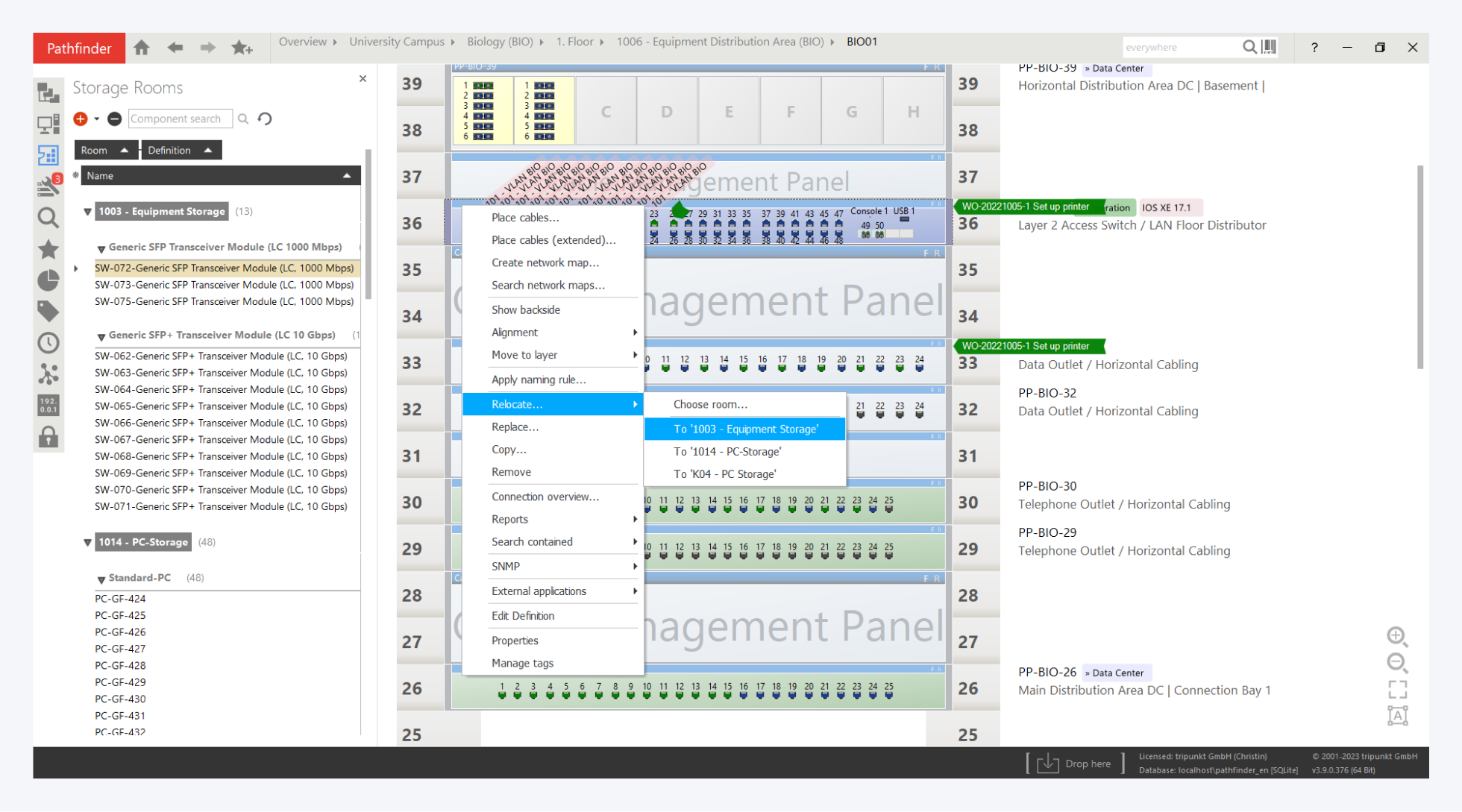 Vice versa, you can use the Relocate function to move components from a rack or room directly to a storage room. You can also find an overview of the supported relocation functions for components and modules here.