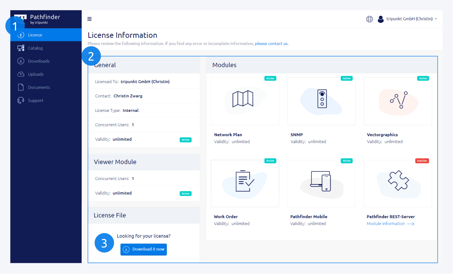 You can enter your GUID/ Pathfinder ID/ Start Code here (2). You can find the license key in the welcome email sent to your inbox from tripunkt.
