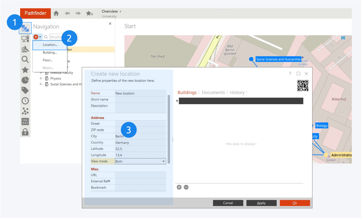 To create a new location, click on the navigation icon (1) on the sidebar (Alt + N). Click the add-icon and select Location (2) from the drop down menu. Fill out the information for your new location (3) and select OK to add your location on the map.