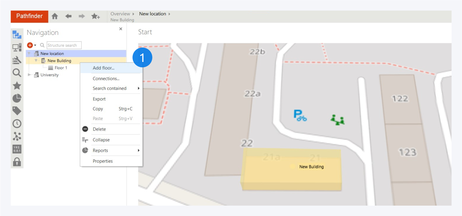 Right click on your newly created building from the navigation tab or map and select add floor (1) from the context menu.