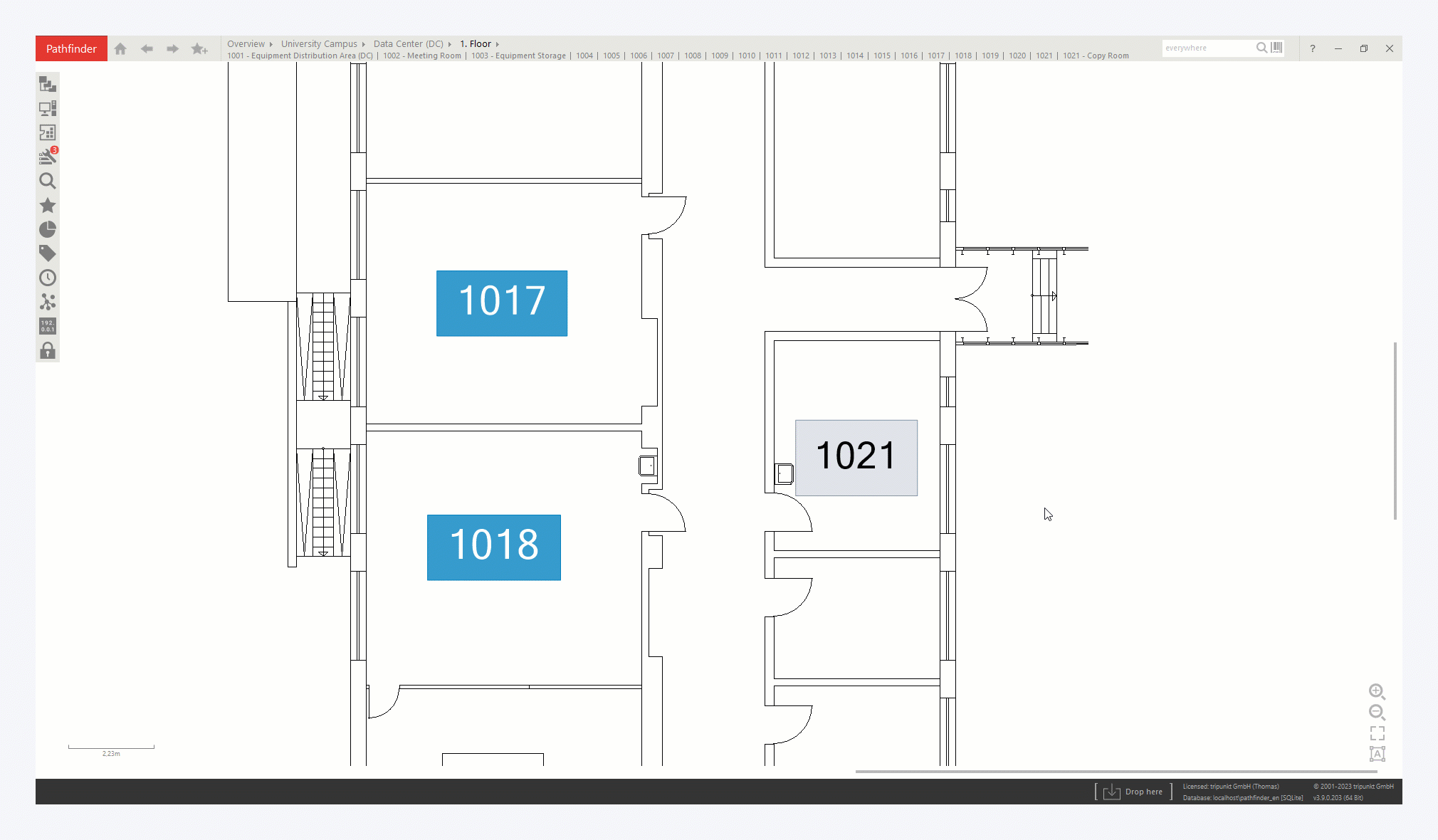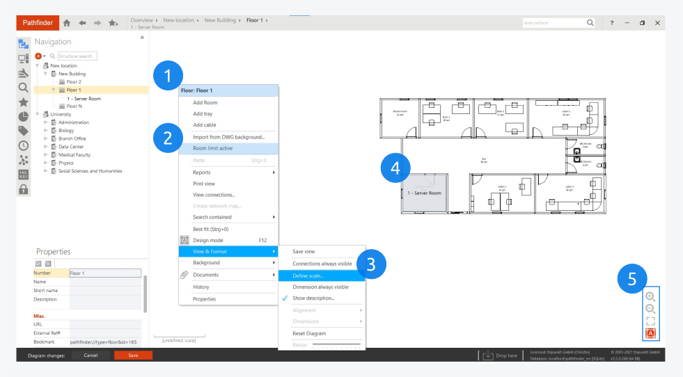 In Pathfinder, it is possible to define nested infrastructures and therefore, accurately reproduce realistic construction conditions for buildings, floors and rooms. This can be done easily from the Navigation module in the sidebar.