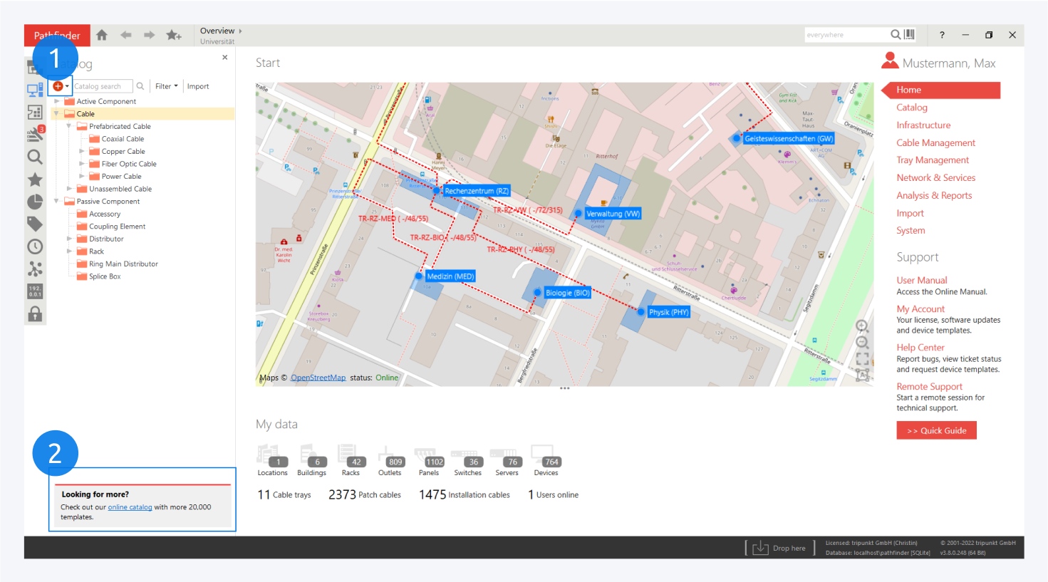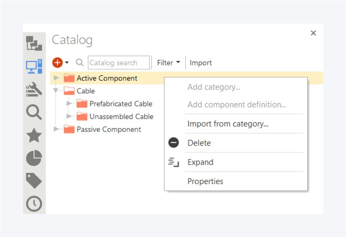 It contains all the component and cable definitions that were either imported from the online catalog or created locally.