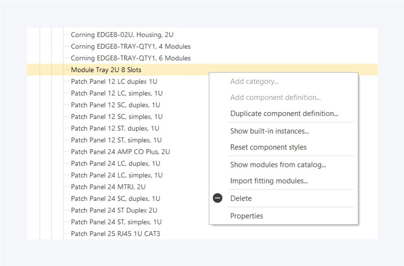 You would ideally start the documentation of your network in Pathfinder by first building your catalog, i.e. by importing every component definition used in your physical network.