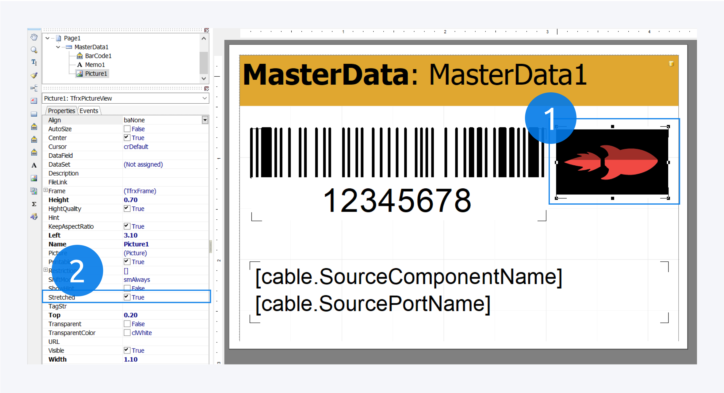 If you do not see your image on the label when adding an image file (1), try changing the stretch option (2) in properties and resizing the image. When using barcodes or QR codes (3) for your labels please make sure to use qrAuto for the Encoding (4). This label will print the barcode for the instance in Pathfinder, the component name and the port name. A list of placeholders used to retrieve specific information from a component or cable to print on your labels can be found in the table Placeholder at the end of this page. |