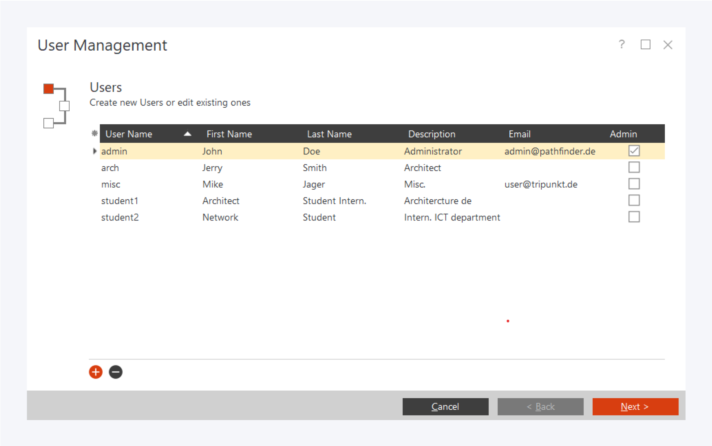 In the user management dialog window, you can manage the user accounts and grant permission for your Pathfinder software.