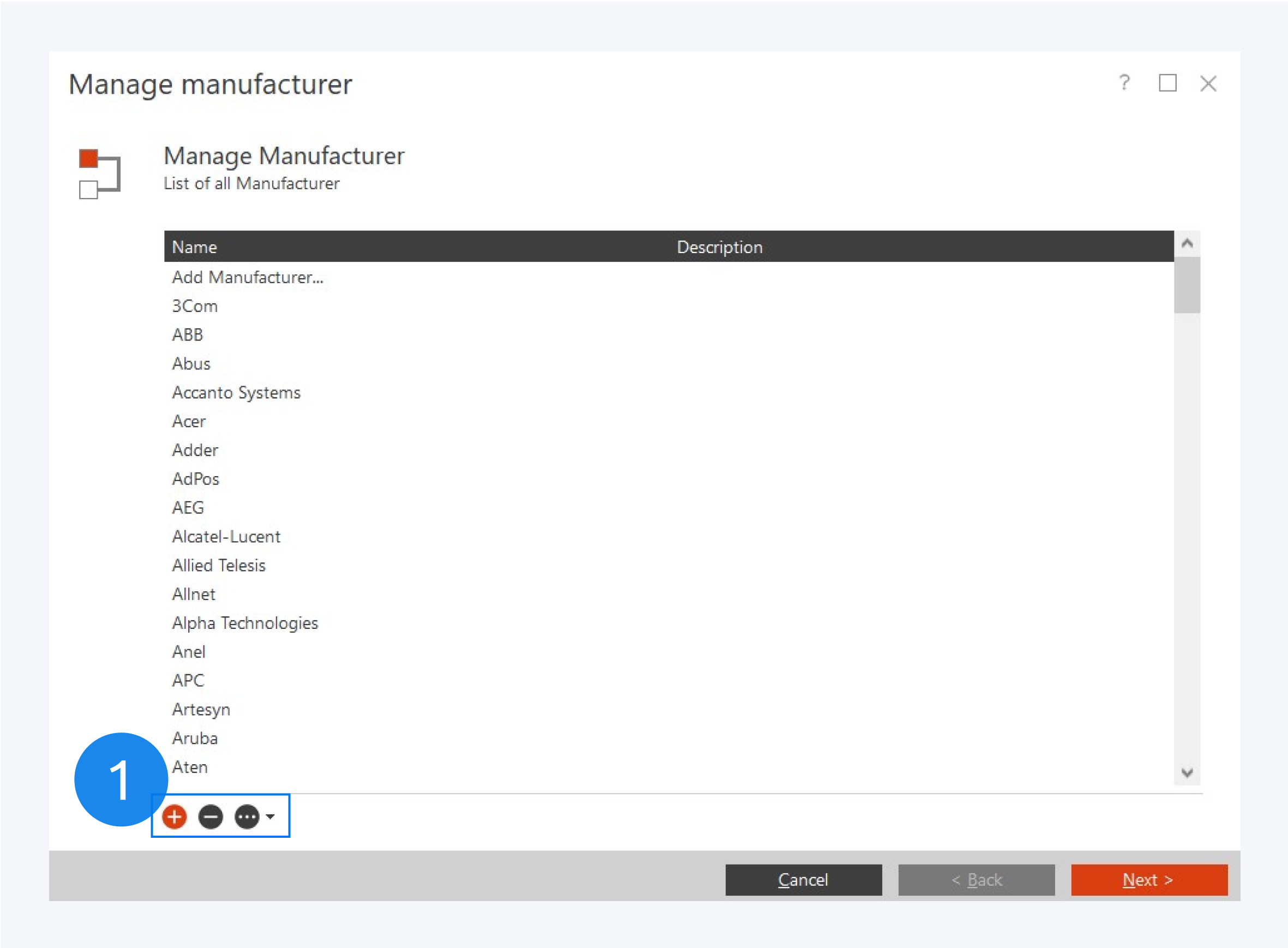 To edit an existing manufacturer just double click on the vendor name from the list. Using the add, delete and import buttons (1), new vendor information can be created, existing vendor information can be deleted and more vendor information can be imported from the online catalog.