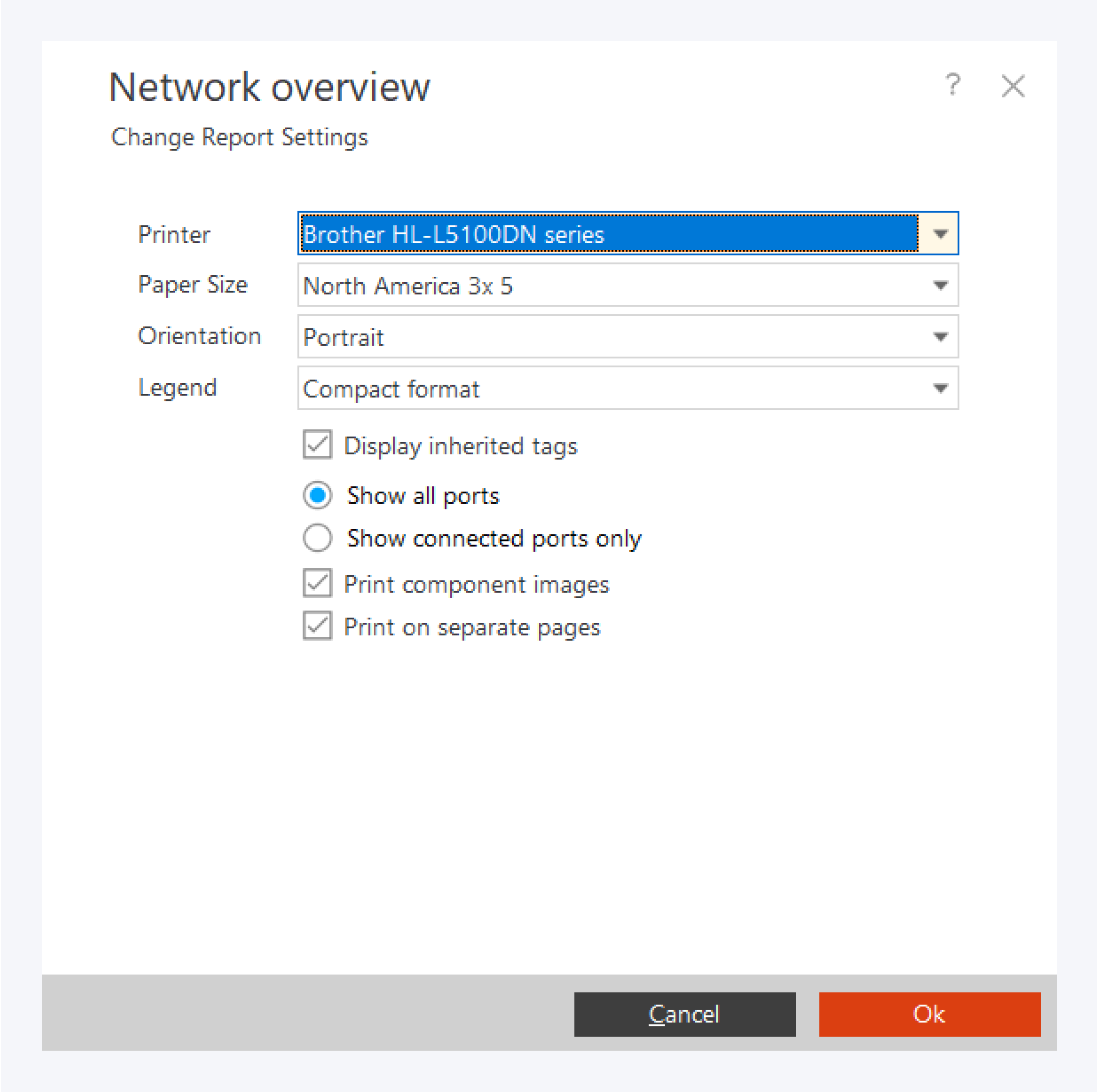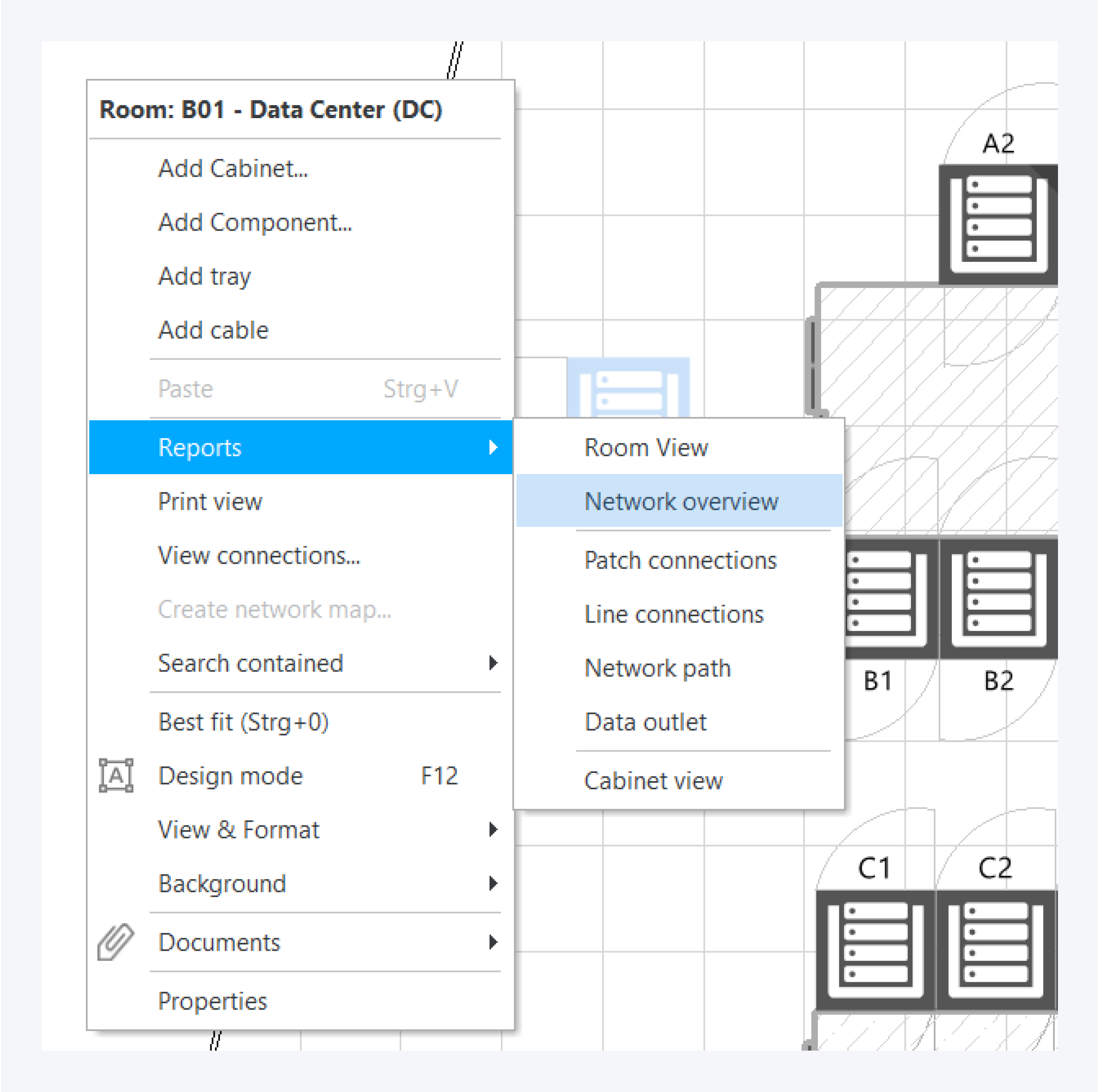 You can create a network overview report for any component, cabinet or location using the reports option from the context menu.